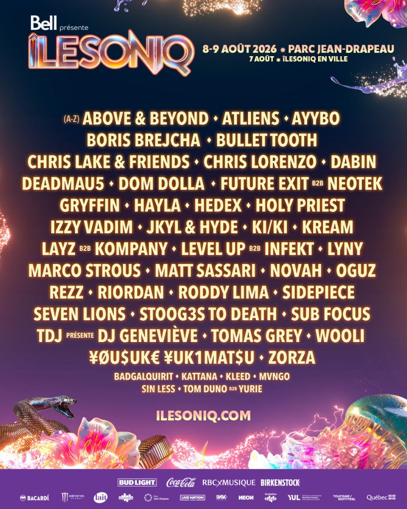 La 11e édition d’îLESONIQ aura lieu les 8 et 9 août prochain au Parc Jean-Drapeau. Cette année, les têtes d’affiche sont Dom Dolla et Chris Lake, qui termineront sûrement les journées. Sinon, on retrouve dans la programmation Deadmau5, Level Up, TDJ (mais en version DJ), Above & Beyond, Wooli, REZZ et plusieurs autres.