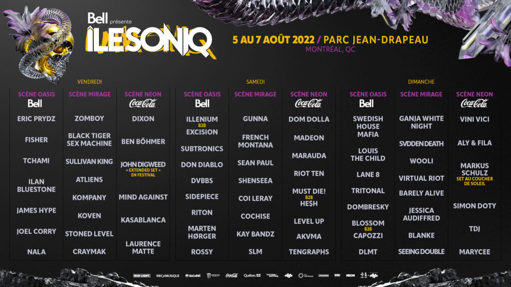 En plus de tous les spectacles annoncés précédemment, dont ceux de FISHER, Louis The Child, Sean Paul, Coi Leray et French Montana pour ne nommer que ceux-ci, on retrouvera plusieurs autres artistes d’ici et d’ailleurs. Notamment, l’ÎLESONIQ présentera les spectacles du trio de dark bass Black Tiger Sex Machine, de l’artiste de techno allemand Dixon et Don Diablo « qui représentera la scène EDM hollandaise », comme l’explique le communiqué de presse accompagnant la nouvelle. Les lauréats du prix Groupe ou Duo d’Électro / Dance de l’année aux Canadian Music Week Indie Awards de 2021, DVBBS, seront également de la fête.
