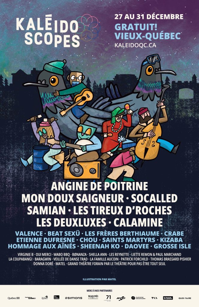 Les fans de musique indépendante seront choyés du 27 au 31 décembre prochain dans le Vieux-Québec! Cette année, Kaléidoscopes propose une programmation bien intéressante avec comme têtes d’affiche Angine de Poitrine, Mon Doux Saigneur, Samian, Calamine, Les Deuxluxes, les Tireux d’Roches et Socalled.