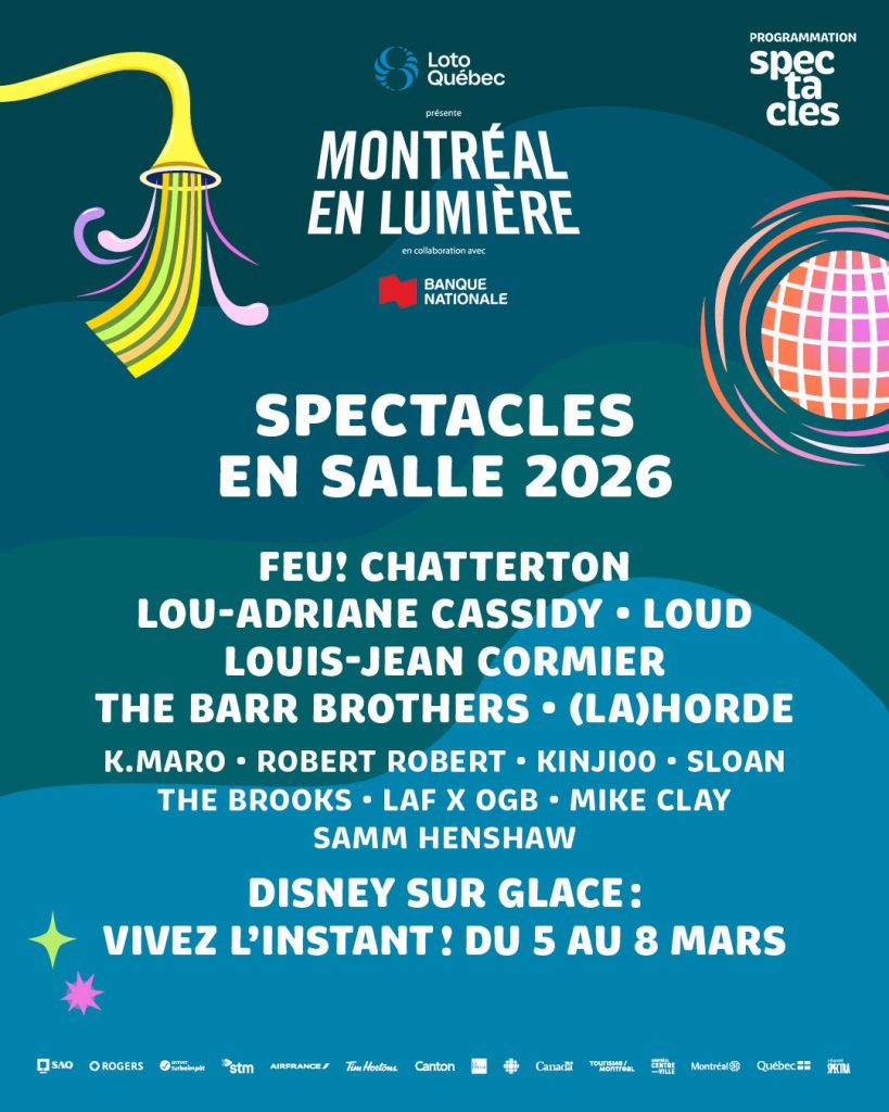 Cette année, on retrouve de nombreux concerts d’artistes québécois à l’affiche de Montréal en Lumière. On pourra y voir Loud, qui présentera les pièces de son nouvel album à venir le 12 décembre, alors que Lou-Adriane Cassidy fera le premier de ses deux MTELUS de l’année. On pourra aussi y voir Louis-Jean Cormier, LaF et O.G.B. qui uniront leurs efforts pour un concert entre amis, The Barr Brothers fera sa rentrée montréalaise alors que Mike Clay et The Brooks ajouteront du groove. Finalement, Robert Robert Kinji00 et K.Maro seront aussi à l’affiche.