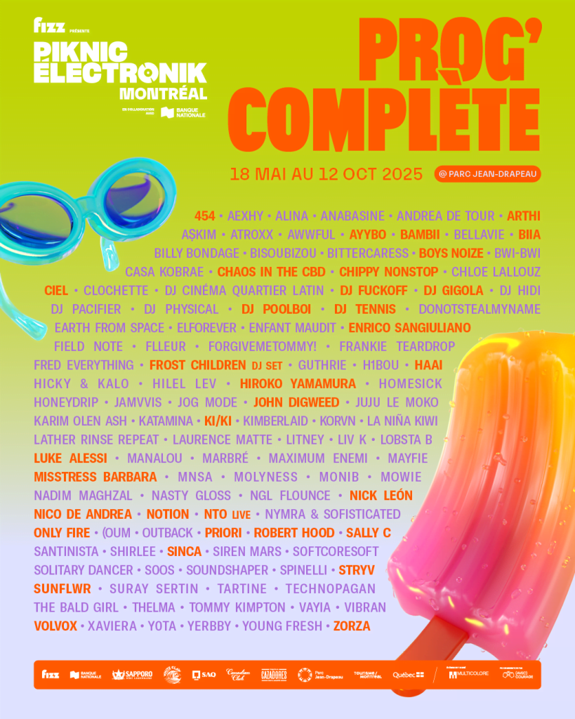 Du 18 mai au 12 octobre, le Piknic Électronik propose une programmation de musique électronique de qualité au parc Jean-Drepeau. Cette année, parmi les noms qui retiennent l’attention, on retrouve notamment Boys Noize, Bambii, Chloe Lallouz, Lobsta B, Fred Everything, Honeydrip, HAAi, Priori, Nick Léon, entre autres.