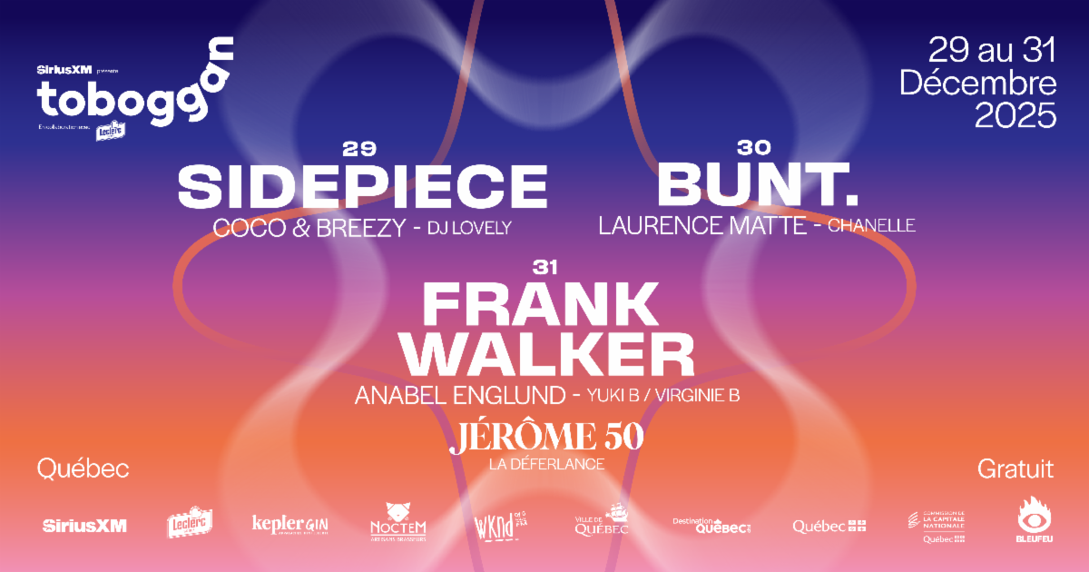 Toboggan 2025 aura lieu du 29 au 31 décembre prochain. 29 décembre : SIDEPIECE, Coco & Breezy, DJ Lovely30 décembre : BUNT., Laurence Matte, Chanelle31 décembre : Frank Walker, Anabel Englund, Yuki B, Virginie B, Jérôme 50, La Déferlance, La Bottine Souriante