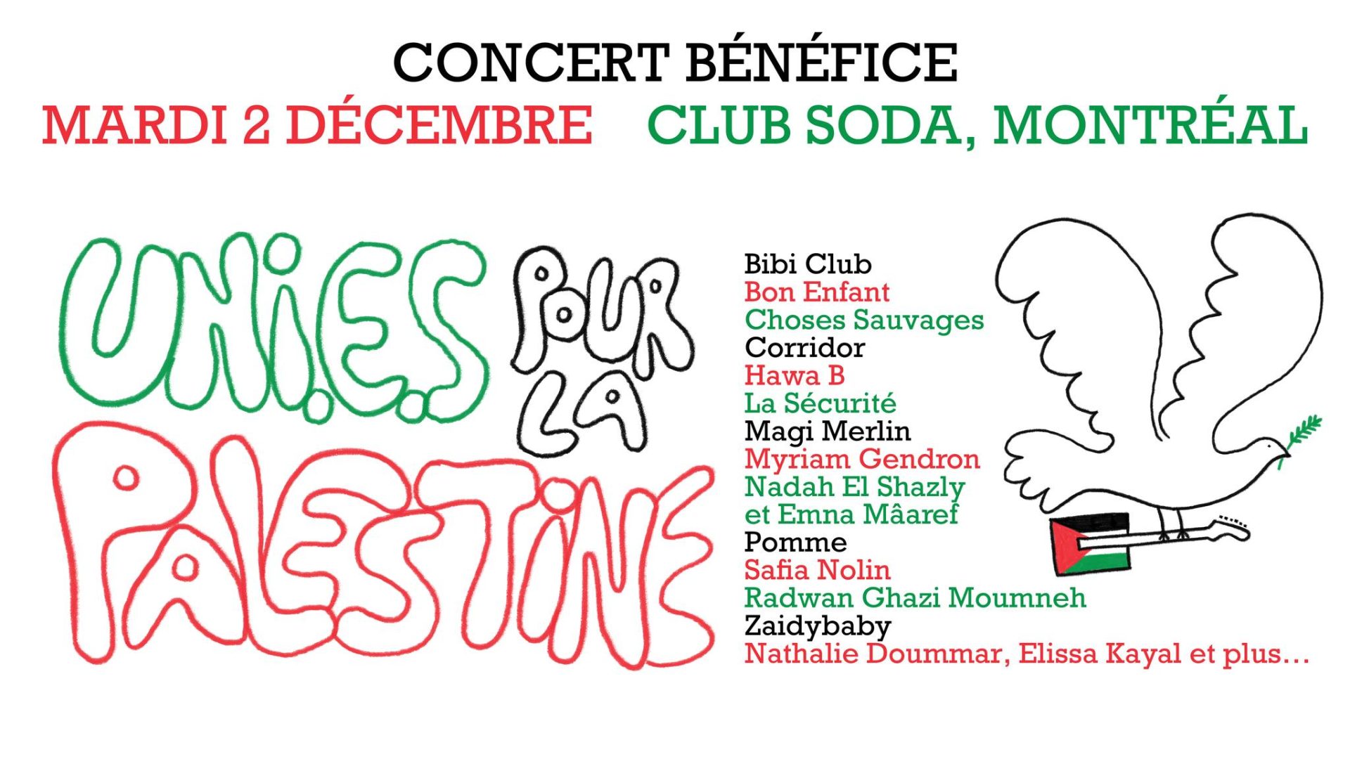 Un collectif présentera un spectacle-bénéfice le 2 décembre au Club Soda. Se succéderont Bibi Club, Bon Enfant, Choses Sauvages, Corridor, HAWA B, La Sécurité, Magi Merlin, Myriam Gendron, Nadah El Shazly et Emna Mâaref, Pomme, Safia Nolin, Radwan Ghazi Moumneh et Zaidybaby, offrant la musique comme baume et espace de rassemblement autour des prises de…
