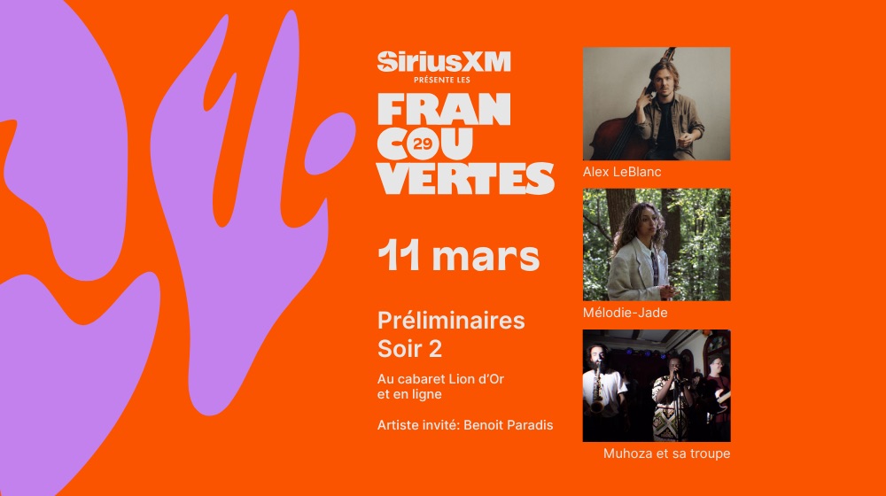 La deuxième soirée des Francouvertes 2025 sera l'affaire des projets Muhoza et sa troupe, Mélodie-Jade et Alex LeBlanc. Le projet invité de la soirée sera Benoit Paradis.