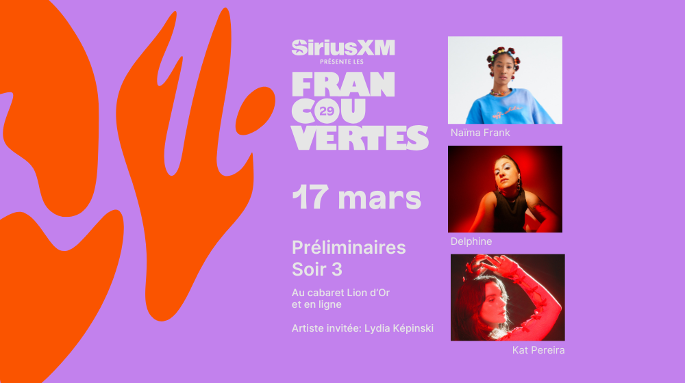 La troisième soirée des préliminaires des Francouvertes 2025 mettra en scène Naïma Frank, Delphine et Kat Pereira.
