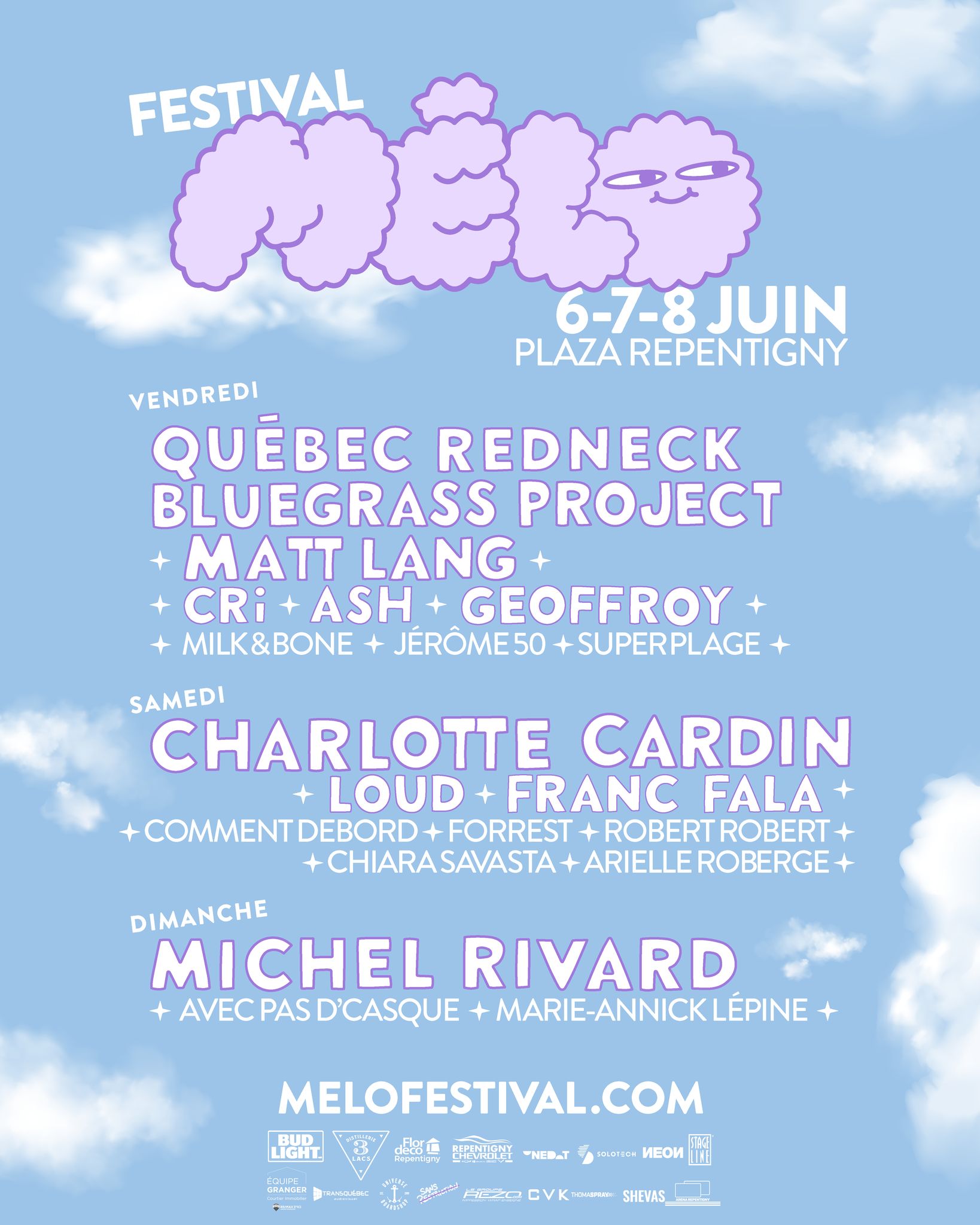 Le Festival Mélo aura lieu du 6 au 8 juin à Repentigny et met en vedette : Québec Redneck Bluegrass Project, Charlottte Cardin, Michel Rivard, Matt Lang, CRi, Ash, Geoffroy, Milk & Bone, Jérôme 50, Super Plage, Loud, Franc Fala, comment debord, Forrest, Robert Robert, Chiara Savasta, Arielle Roberge, Avec pas d'casque et Marie-Annick Lépine.