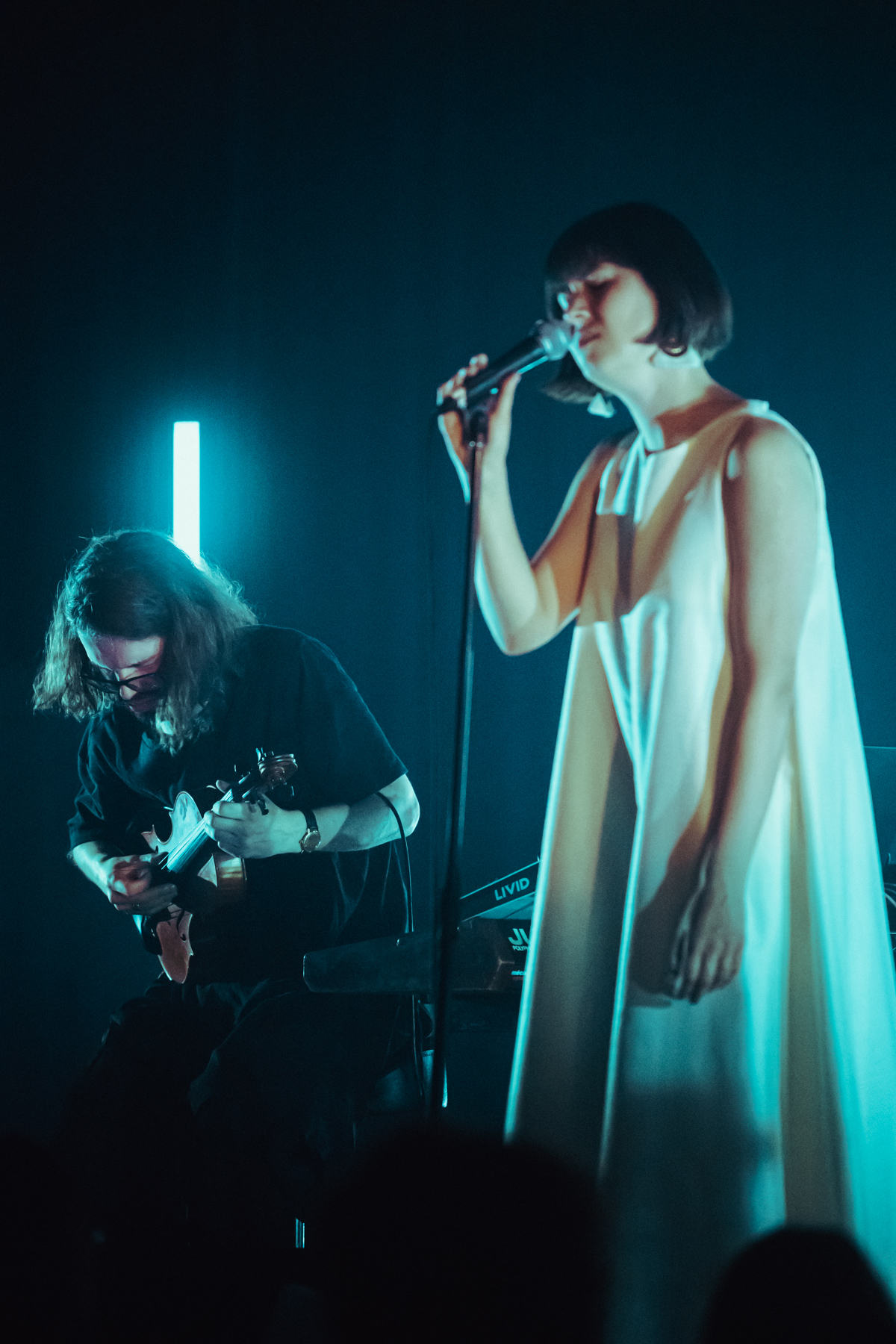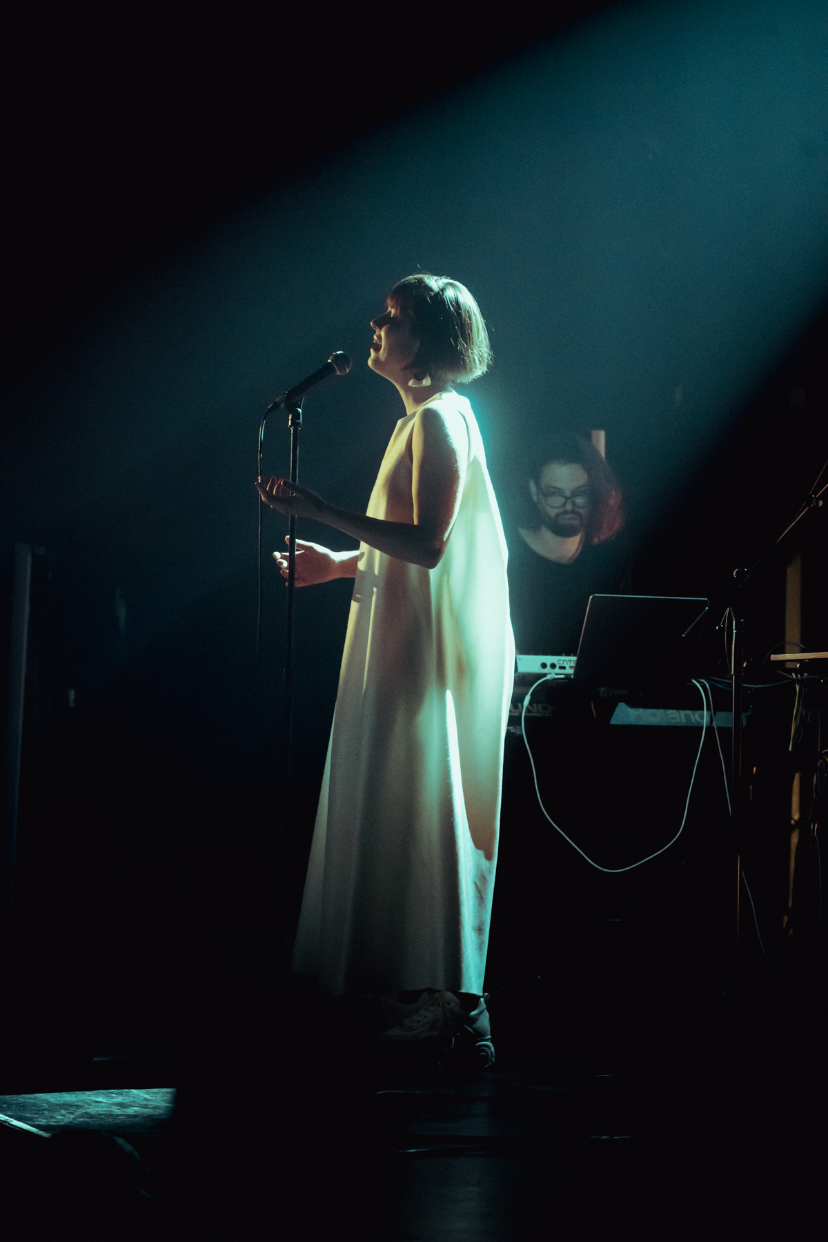 La chanteuse s’est postée derrière son micro, éclairée par un simple halo de lumière blanchâtre, avec Borboën-Léonard, en biais, assis derrière sa grande table de sons. Puis, sans plus tarder, on a été introduit à l’univers mystique de ce projet aux chansons électros liturgiques marquées par la voix magistrale de l’artiste et par les productions aux basses vrombissantes de son acolyte.