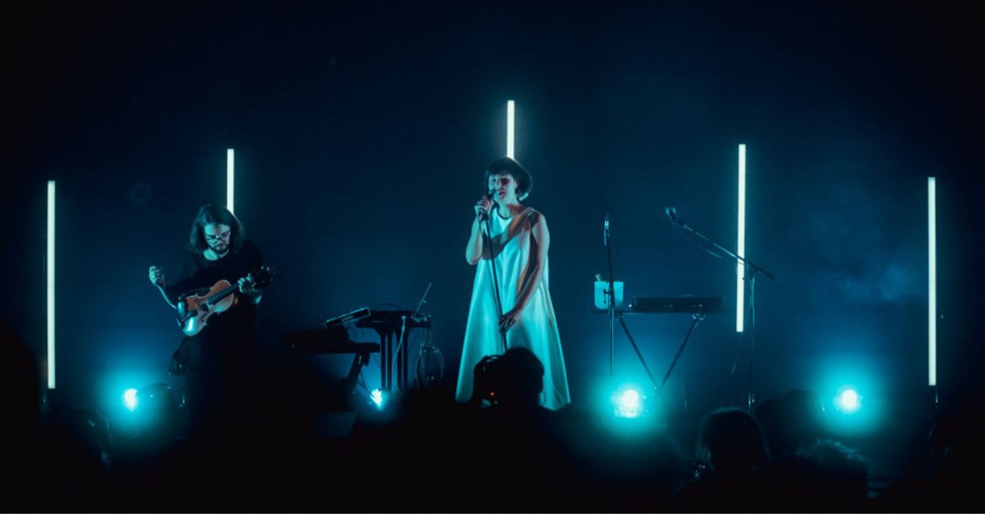 L’artiste multidisciplinaire montréalaise Mykalle Bielinski, alias Mykalle, ouvrait le bal dans l’ancien Astral bien garni. Alors que ça jouait du coude, dans l’assistance, pour les dernières places assises disponibles, la chanteuse est apparue sur scène en compagnie du musicien et réalisateur Blaise Borboën-Léonard. Ensemble, ils venaient défendre Da Pacem, un premier album signé Mykalle, paru en janvier 2024.