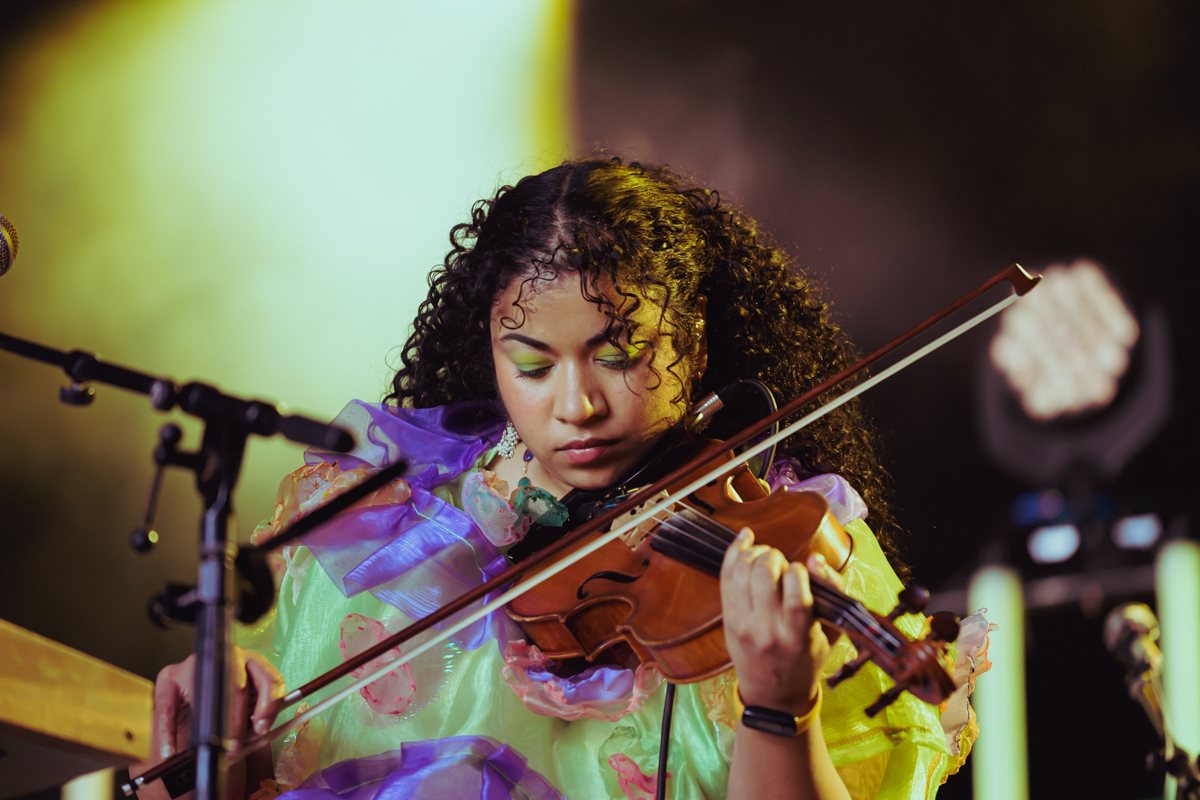 Musicalement, ce qui fonctionne très bien sur scène, ce sont les superbes harmonies entre sa voix, celles de son chœur et la section de cordes. Lorsque les percussions s’en mêlent, l’équipe entière travaille à l’unisson et nous embarque, pendant de longues minutes, dans un voyage confortable et surprenant, avec de nombreuses improvisations qui se déploient ici et là.