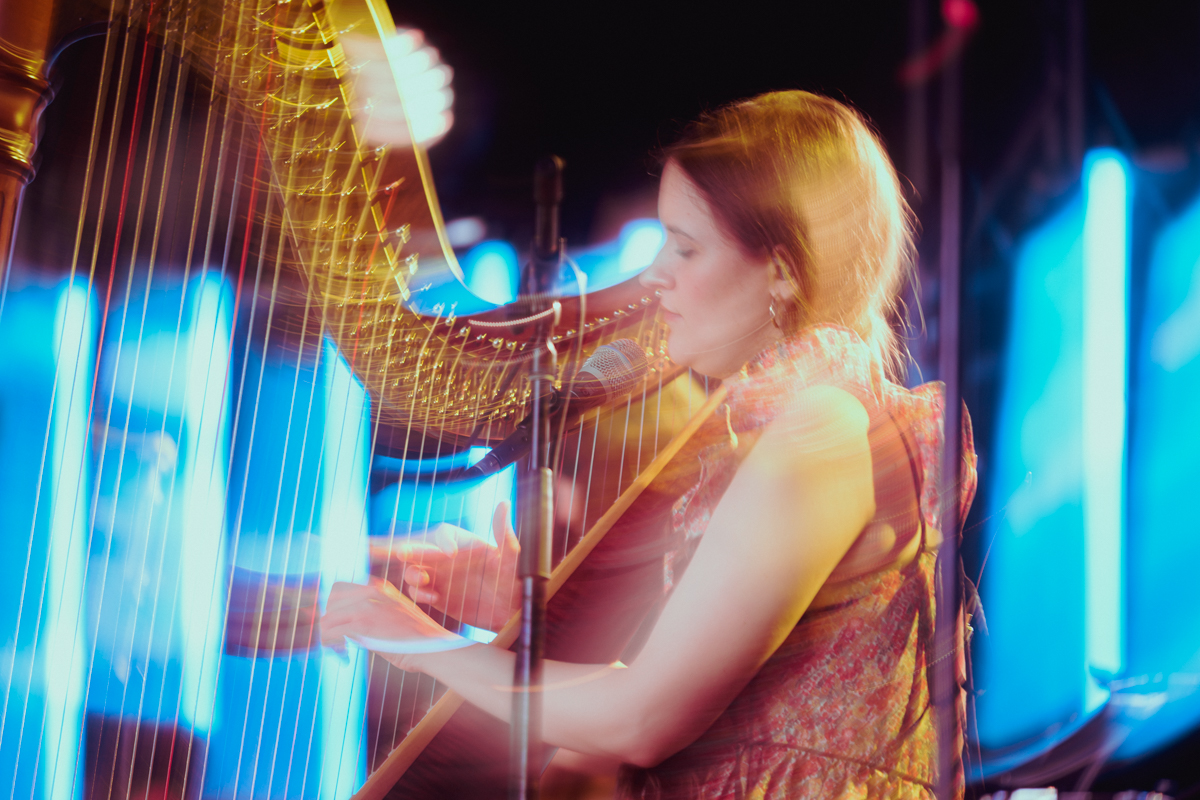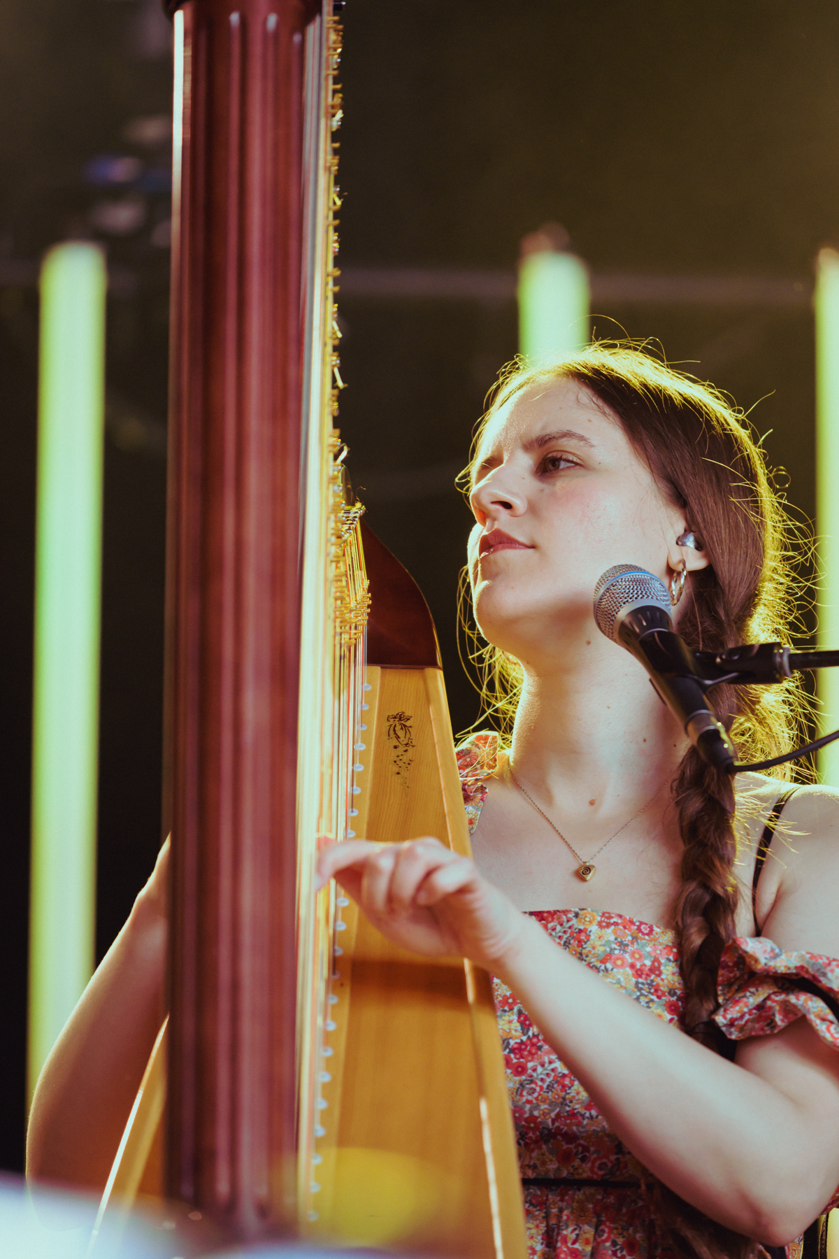 Celle-ci est arrivée avec son impressionnante équipe composée d’un bassiste/clarinettiste, d’un percussionniste, d’une harpiste, de trois choristes, de deux violonistes et d’une violoncelliste. Tout ce beau monde-là a pris place et, dès les premières notes, nous a convié dans l’univers étoffé de la jeune artiste. Cette dernière brillait à l’avant-scène, vêtue d’une incroyable robe bouffante sur laquelle pendaient quelques jolies « décorations », faute d’un meilleur mot.
