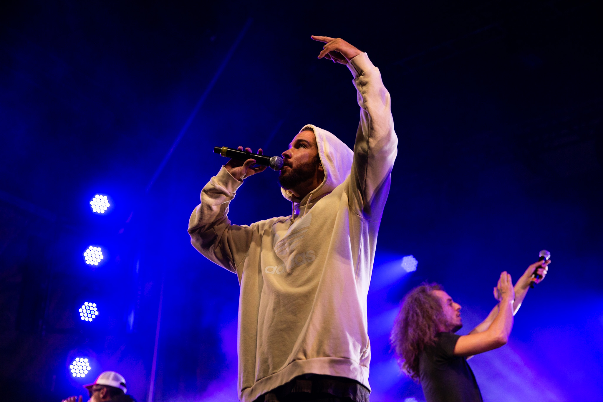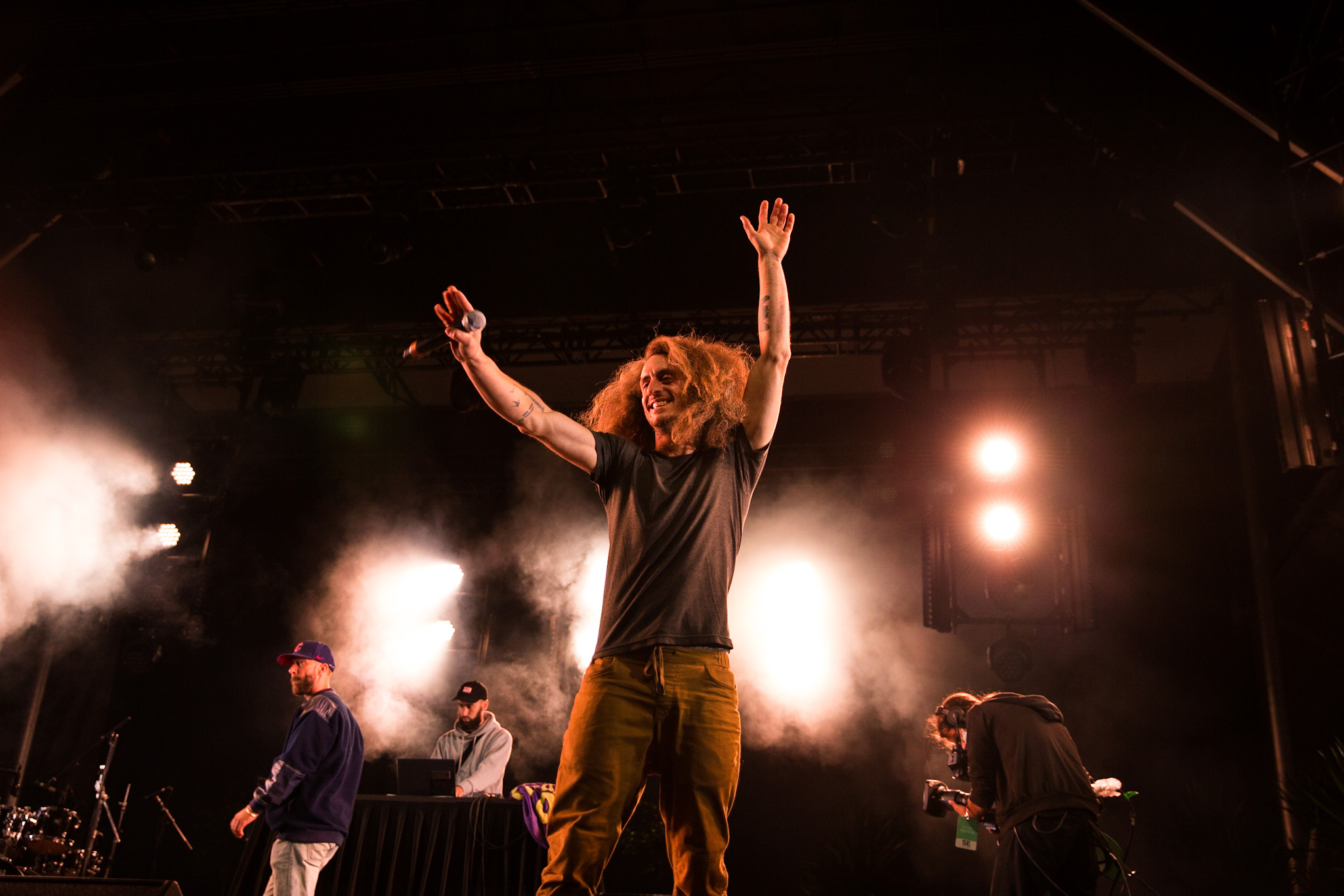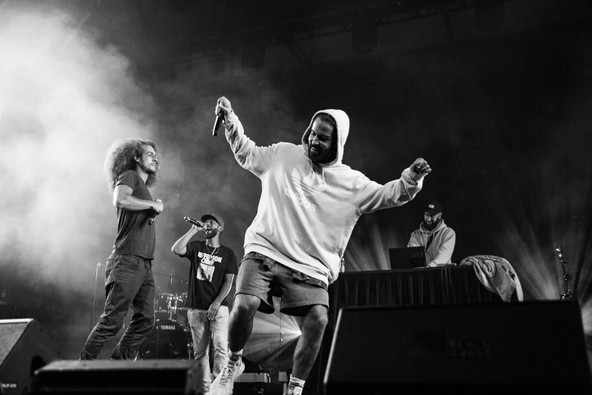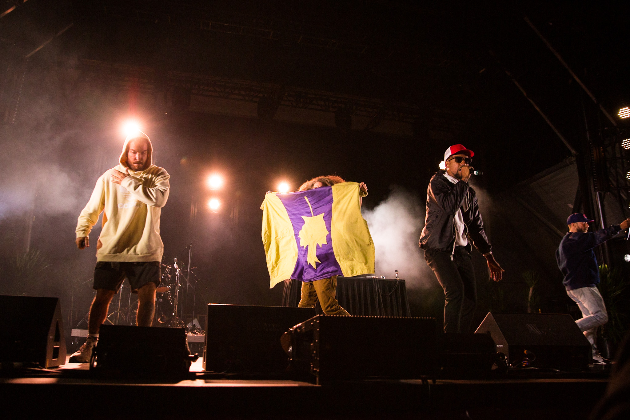 Comme les malheurs n’arrivent jamais seuls, le concert d’Alaclair Ensemble peine à démarrer. Il y a un problème avec le portable de Vlooper. Pendant que le DJ cherche par tous les moyens à régler le problème, les autres membres du groupe s’amusent à nous faire des bruits d’animaux. Voyant que le silence s’étire, Robert Nelson, en bon président, prend la parole et se lance dans une tirade sur la biologie évolutive. On apprend toute sorte de faits intéressants : les femelles paon aiment les grosses queues colorées, l’homme et le chimpanzé n’est distancié que de 1,6% dans ses gênes et visiblement Nelson a du gros respect pour la SEPAQ.