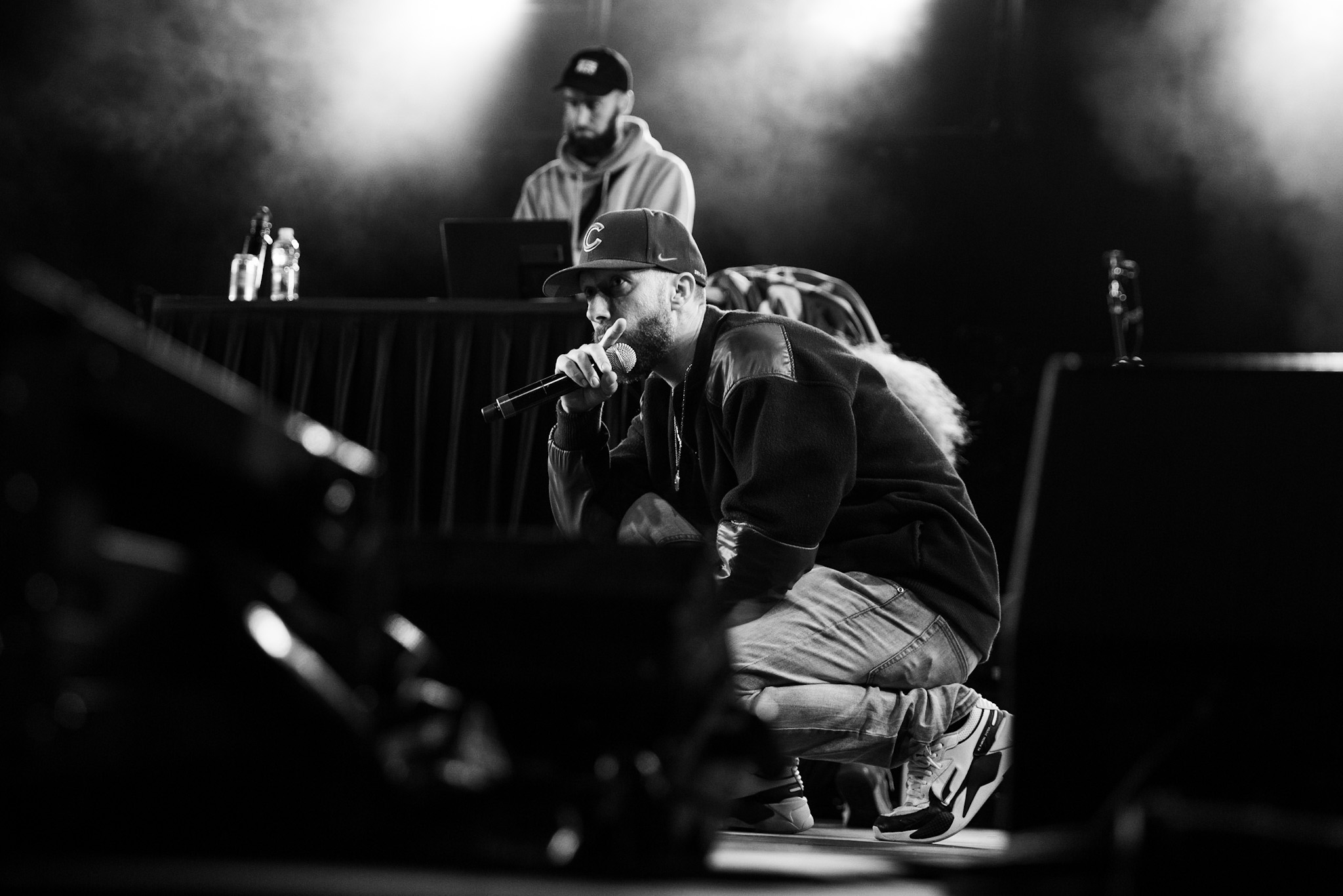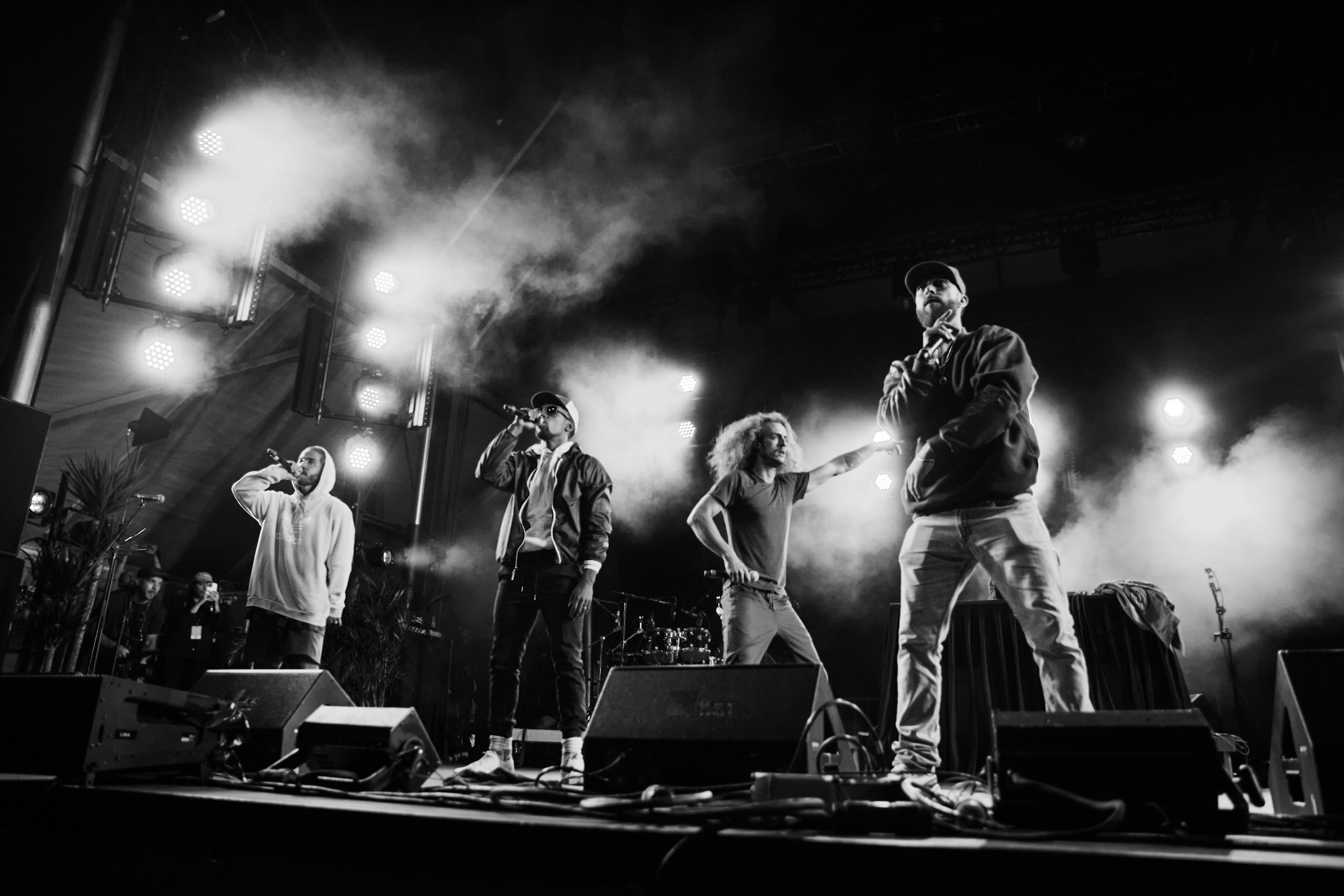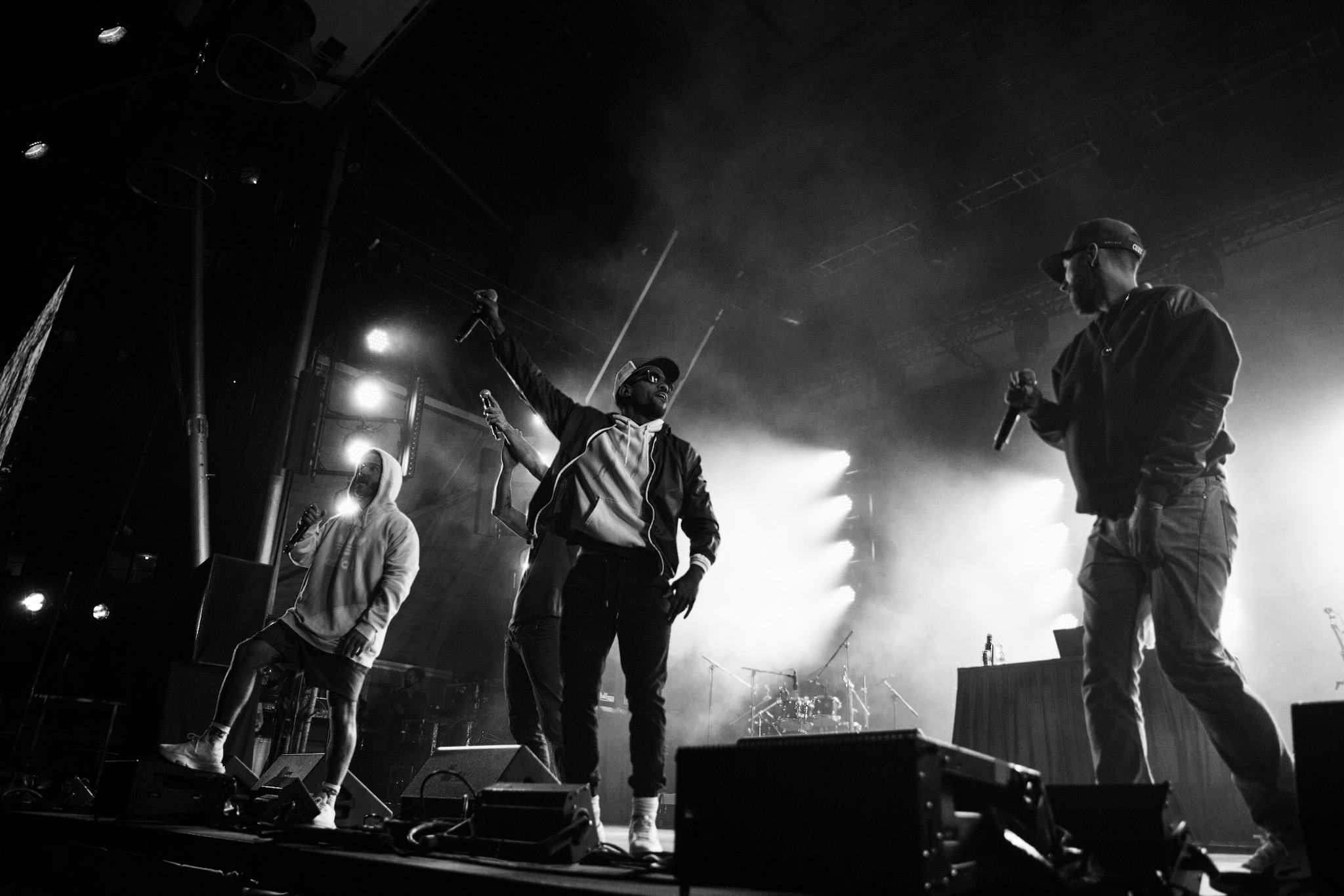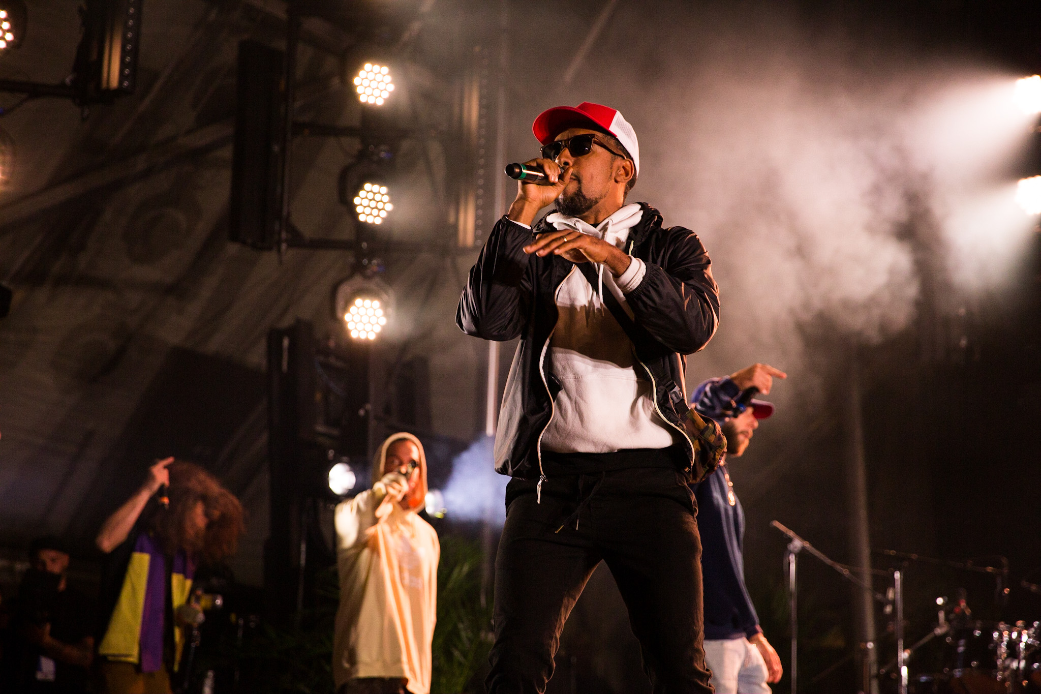 Comme les malheurs n’arrivent jamais seuls, le concert d’Alaclair Ensemble peine à démarrer. Il y a un problème avec le portable de Vlooper. Pendant que le DJ cherche par tous les moyens à régler le problème, les autres membres du groupe s’amusent à nous faire des bruits d’animaux. Voyant que le silence s’étire, Robert Nelson, en bon président, prend la parole et se lance dans une tirade sur la biologie évolutive. On apprend toute sorte de faits intéressants : les femelles paon aiment les grosses queues colorées, l’homme et le chimpanzé n’est distancié que de 1,6% dans ses gênes et visiblement Nelson a du gros respect pour la SEPAQ.