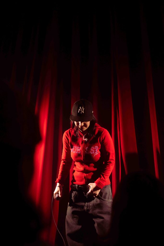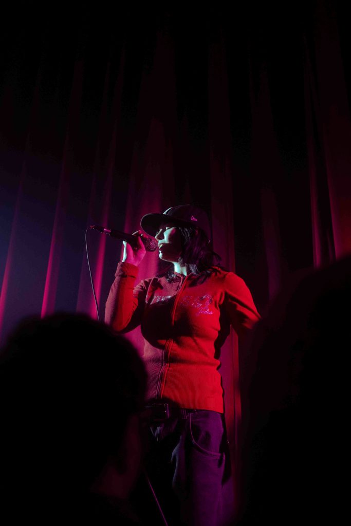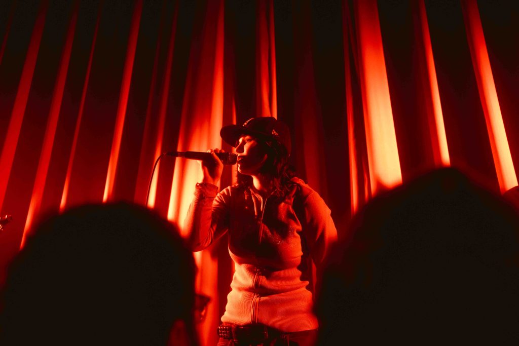 Avant que Marie Céleste embarque sur scène pour jouer les pièces de Tout ce qui brille, c’est la rapeuse Kamilou qui était à l’œuvre devant le rideau. J’ai malheureusement manqué les premières pièces, pris dans la ligne pour le vestiaire. La jeune rappeuse était accompagnée d’un guitariste / DJ et a livré des pièces de son EP Pour toujours et à jamais paru l’an dernier.