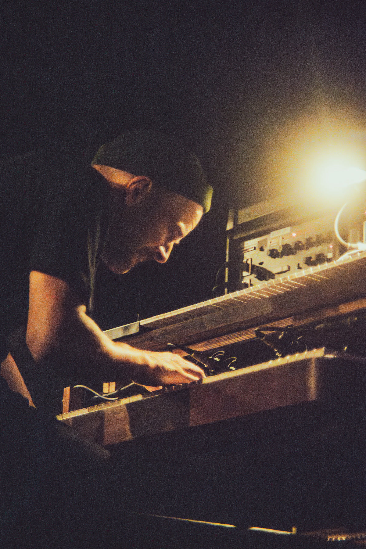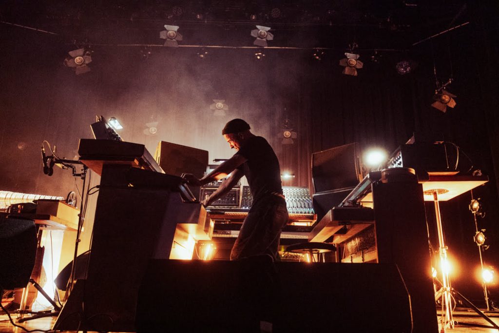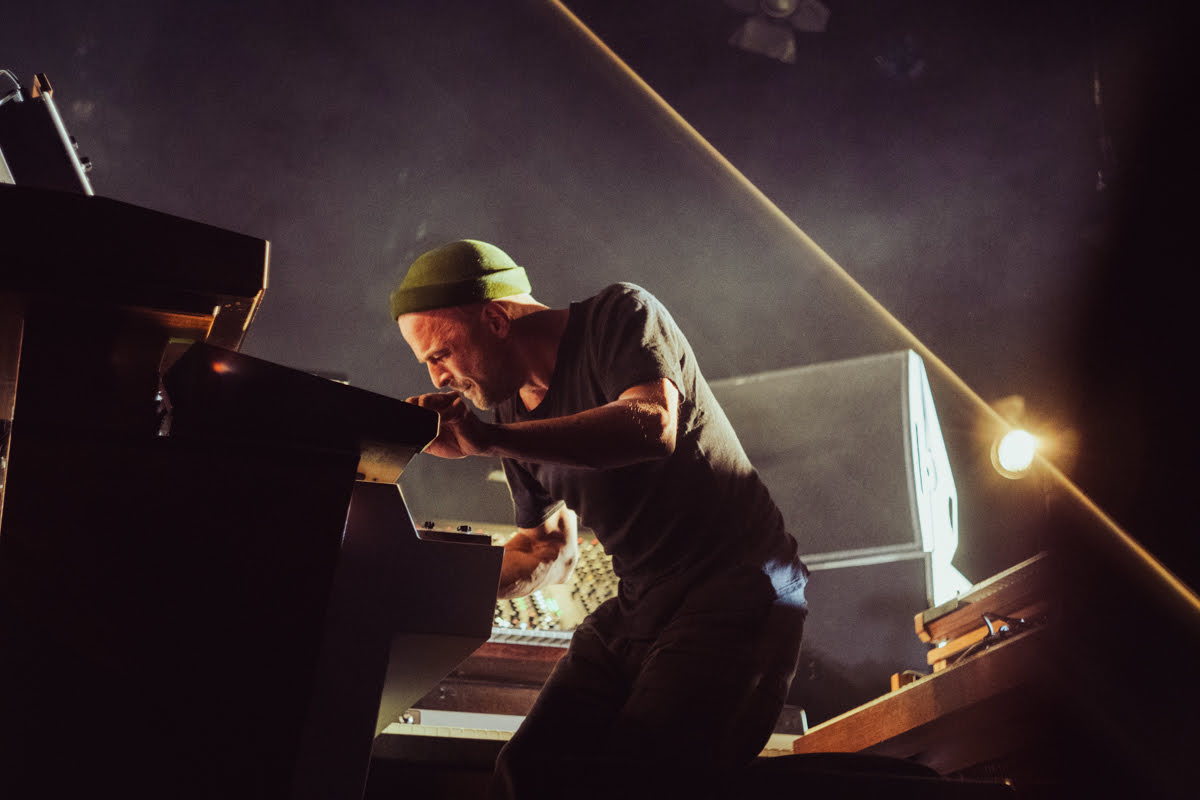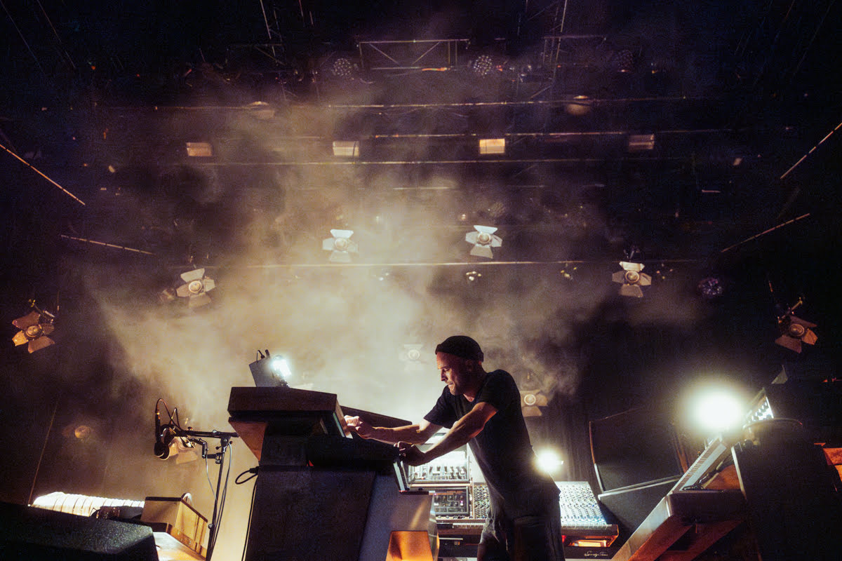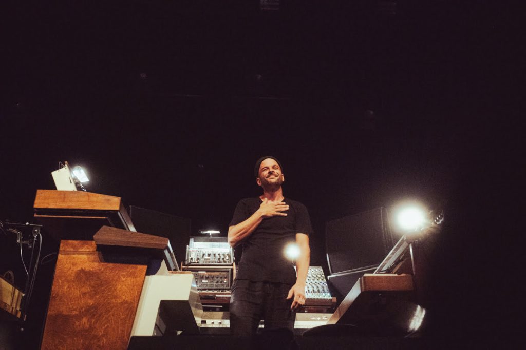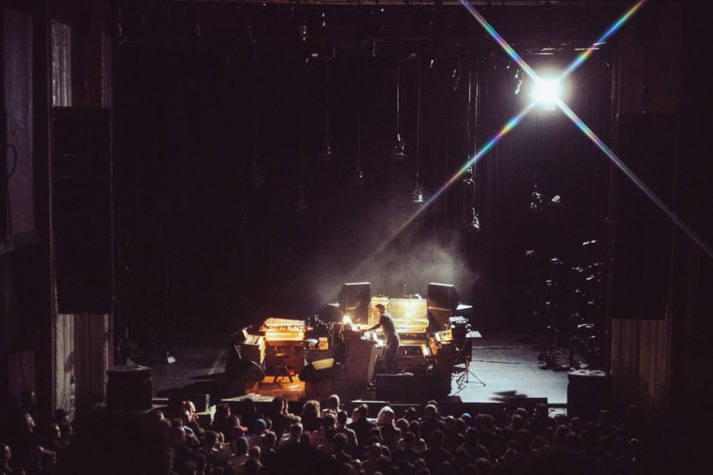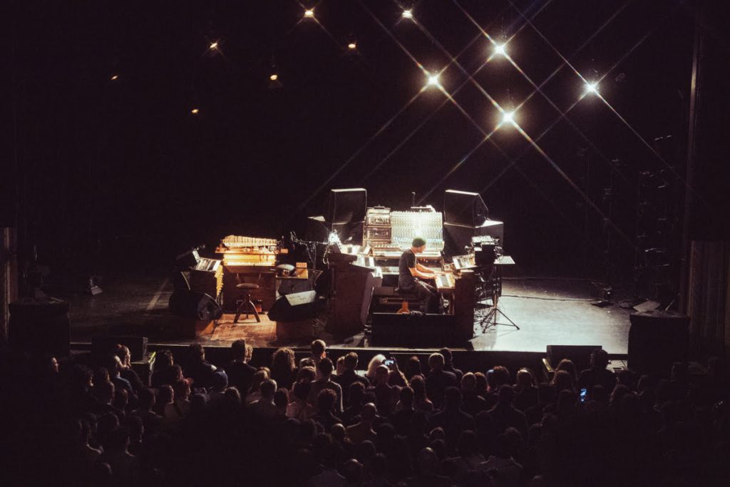 La salle était bien remplie lorsque Nils Frahm est arrivé sur scène après une quinzaine de minutes de délai, encadré par deux stations de claviers. Avis aux geeks d’instruments analogiques, il y avait possiblement pour plus de cent mille dollars d’équipement sur scène, et générait un petit effet de showroom pour les passionnés sur le sujet. C’est d’ailleurs avec un de ses appareils les plus spectaculaires que l’artiste a débuté le spectacle, à l’harmonica de verre pour la pièce Prolog. Il portait des gants mouillés pour jouer sur l’équivalent de coupes de verre placées à l’horizontale qui tournaient à un rythme constant à l’aide d’une roue mécanique. La sonorité éthérique a changé la salle en temple musical, comme une messe d’harmonies pures durant laquelle le public est disparu dans le silence. Frahm a fait évoluer le thème doucement et l’a fait transiter vers des arpèges à l’harmonium, comme une complainte mélancolique. Il a terminé la pièce avec une strate à la Vangelis sur le Juno-60.