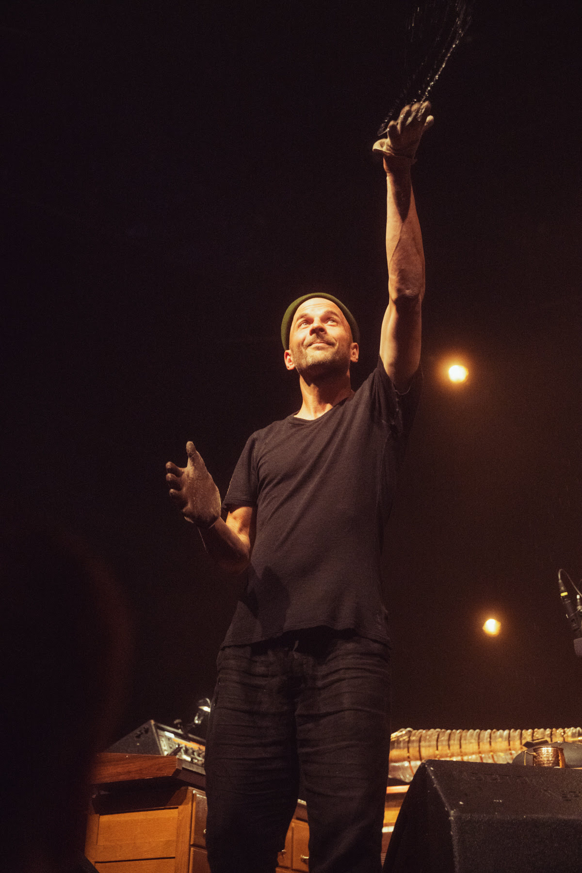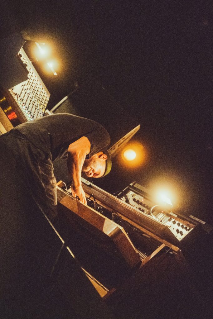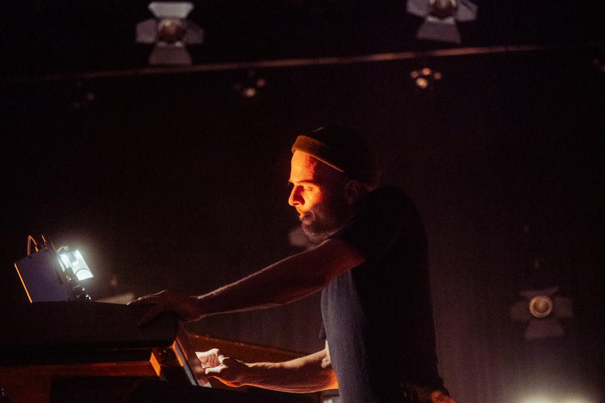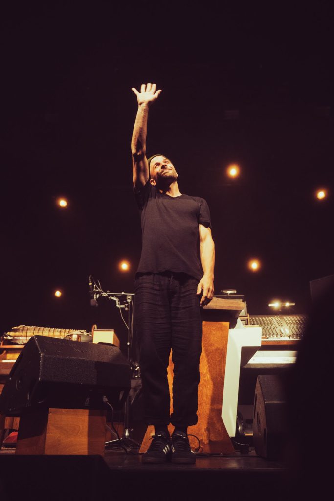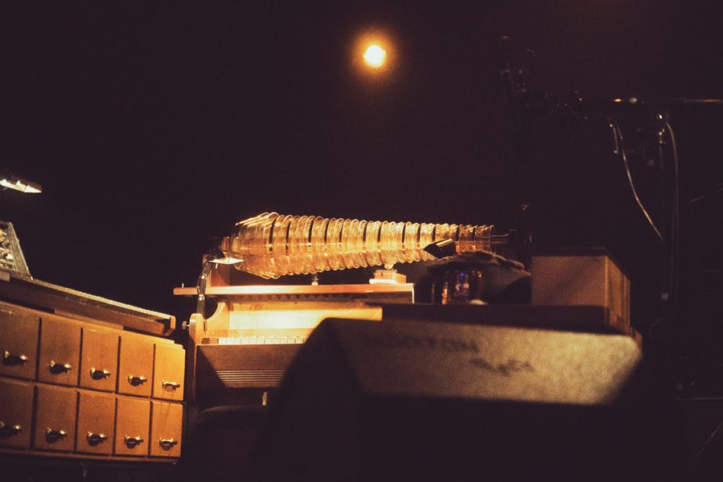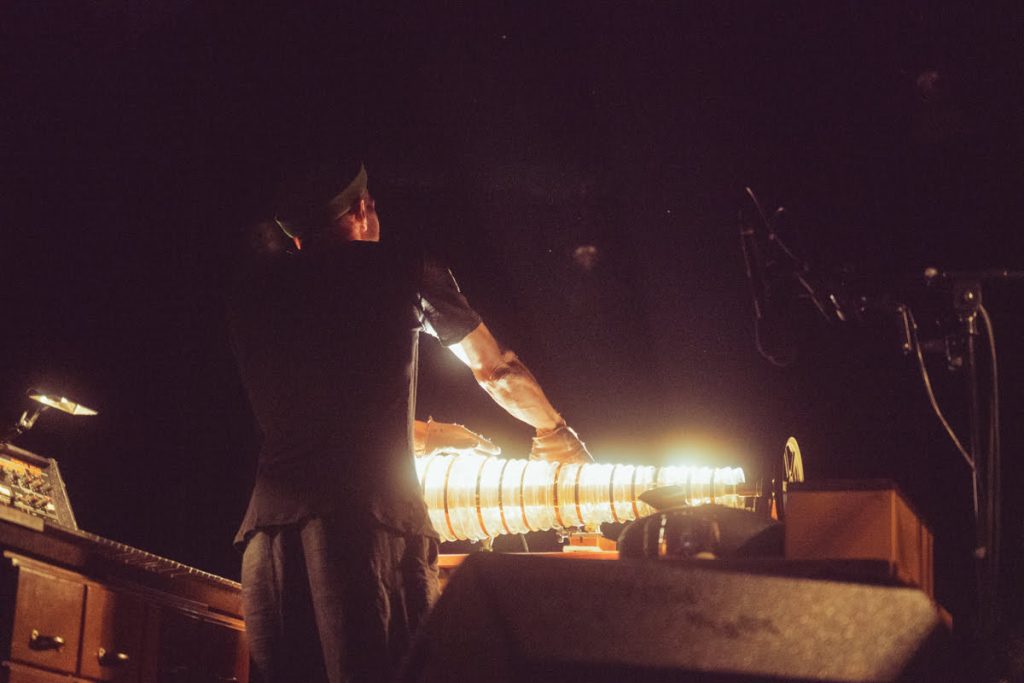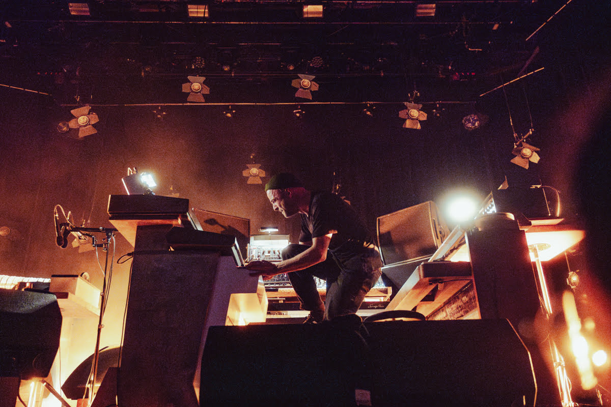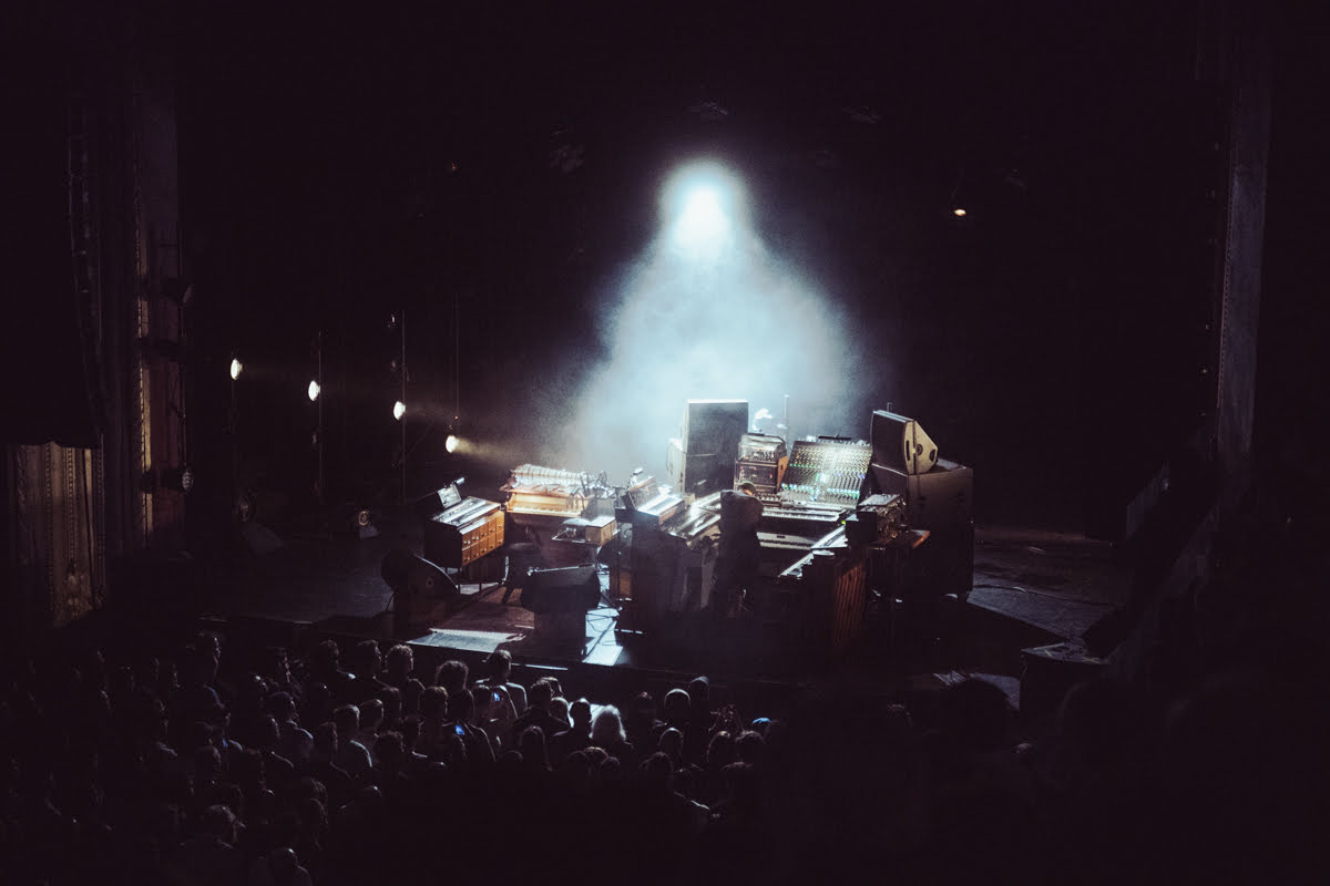 La salle était bien remplie lorsque Nils Frahm est arrivé sur scène après une quinzaine de minutes de délai, encadré par deux stations de claviers. Avis aux geeks d’instruments analogiques, il y avait possiblement pour plus de cent mille dollars d’équipement sur scène, et générait un petit effet de showroom pour les passionnés sur le sujet. C’est d’ailleurs avec un de ses appareils les plus spectaculaires que l’artiste a débuté le spectacle, à l’harmonica de verre pour la pièce Prolog. Il portait des gants mouillés pour jouer sur l’équivalent de coupes de verre placées à l’horizontale qui tournaient à un rythme constant à l’aide d’une roue mécanique. La sonorité éthérique a changé la salle en temple musical, comme une messe d’harmonies pures durant laquelle le public est disparu dans le silence. Frahm a fait évoluer le thème doucement et l’a fait transiter vers des arpèges à l’harmonium, comme une complainte mélancolique. Il a terminé la pièce avec une strate à la Vangelis sur le Juno-60.