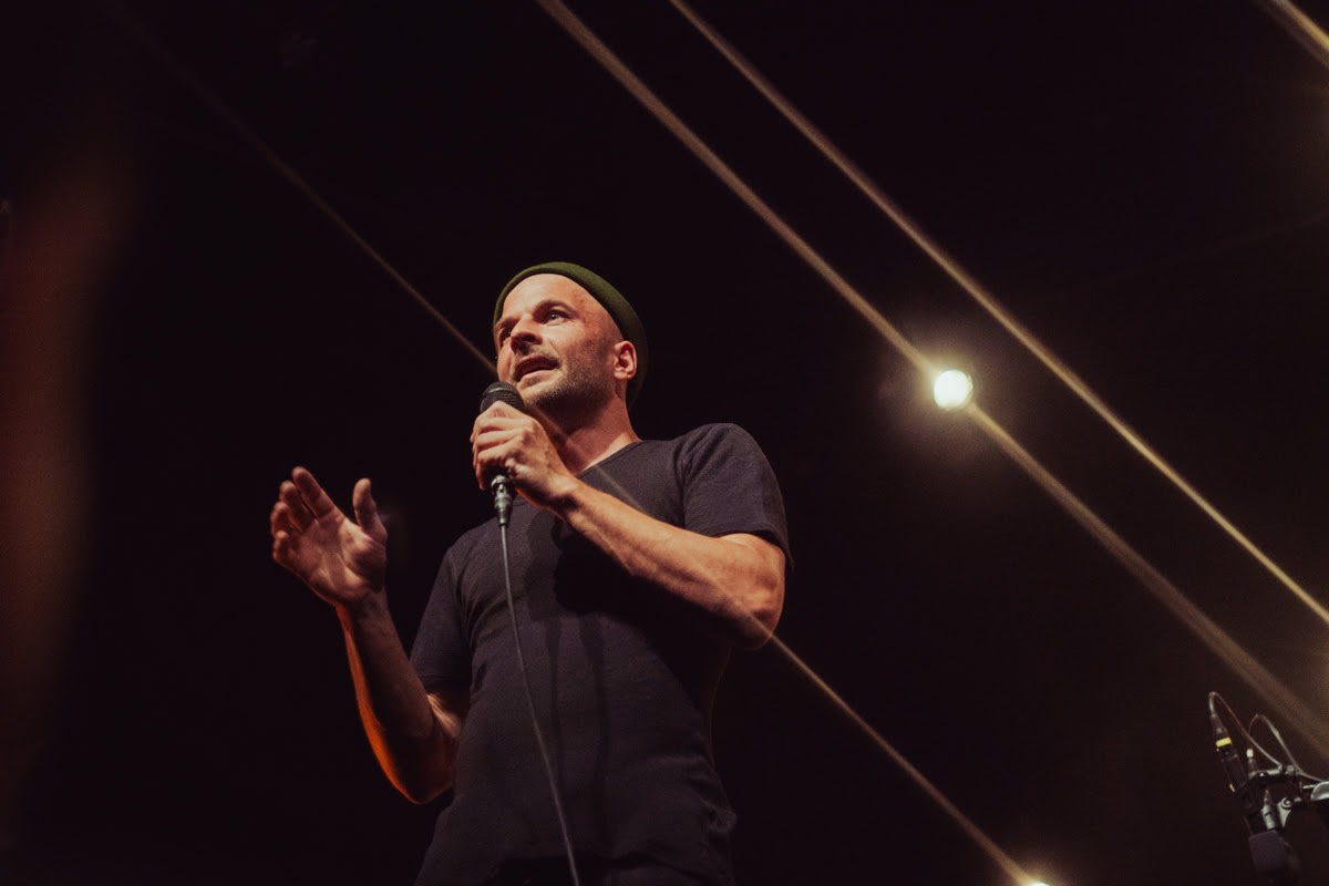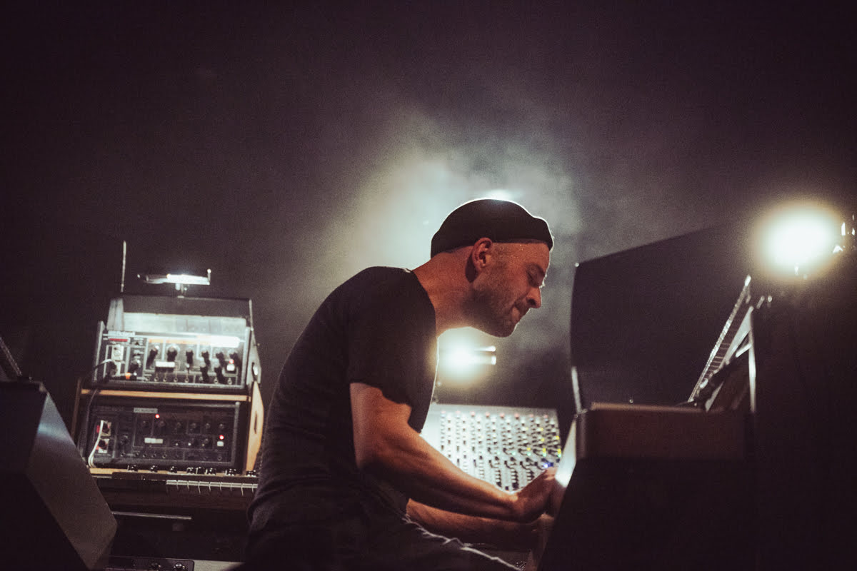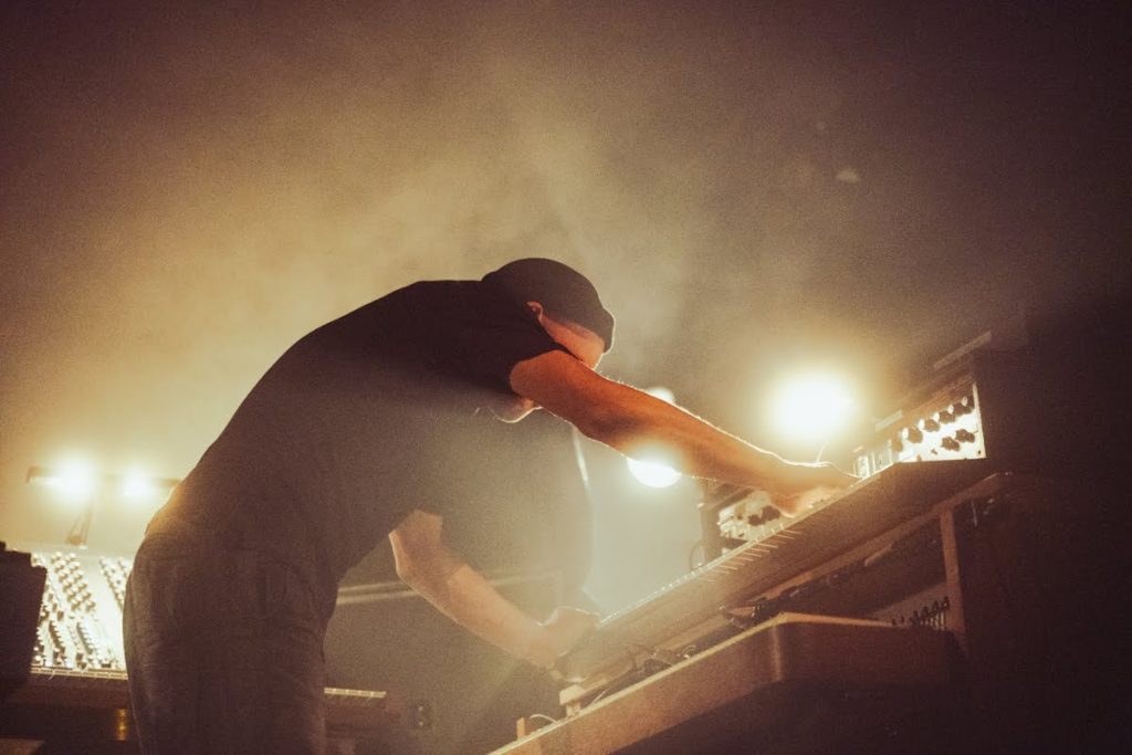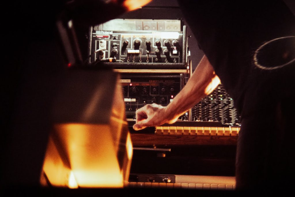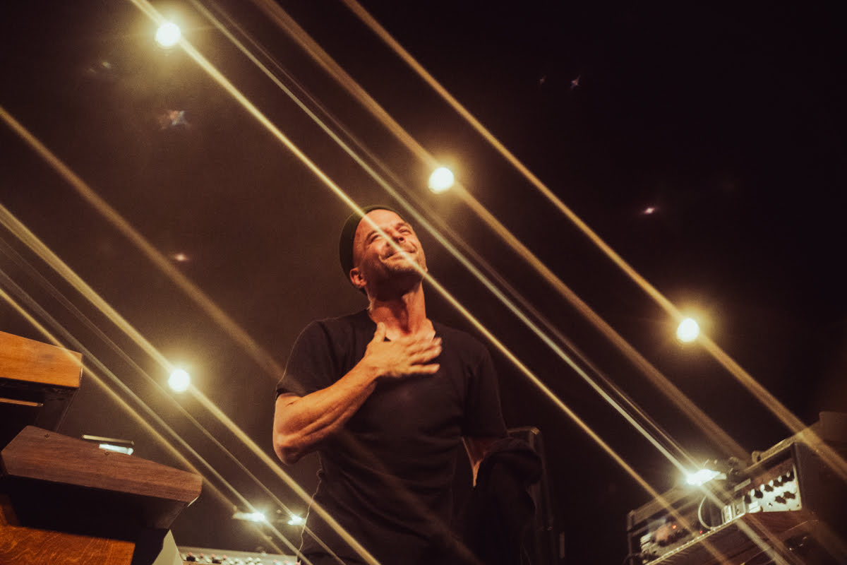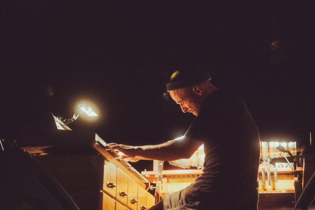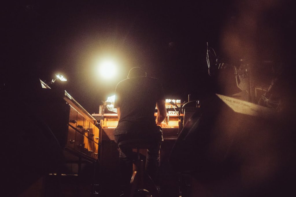 La salle était bien remplie lorsque Nils Frahm est arrivé sur scène après une quinzaine de minutes de délai, encadré par deux stations de claviers. Avis aux geeks d’instruments analogiques, il y avait possiblement pour plus de cent mille dollars d’équipement sur scène, et générait un petit effet de showroom pour les passionnés sur le sujet. C’est d’ailleurs avec un de ses appareils les plus spectaculaires que l’artiste a débuté le spectacle, à l’harmonica de verre pour la pièce Prolog. Il portait des gants mouillés pour jouer sur l’équivalent de coupes de verre placées à l’horizontale qui tournaient à un rythme constant à l’aide d’une roue mécanique. La sonorité éthérique a changé la salle en temple musical, comme une messe d’harmonies pures durant laquelle le public est disparu dans le silence. Frahm a fait évoluer le thème doucement et l’a fait transiter vers des arpèges à l’harmonium, comme une complainte mélancolique. Il a terminé la pièce avec une strate à la Vangelis sur le Juno-60.