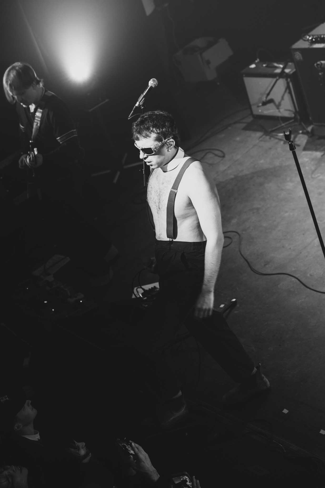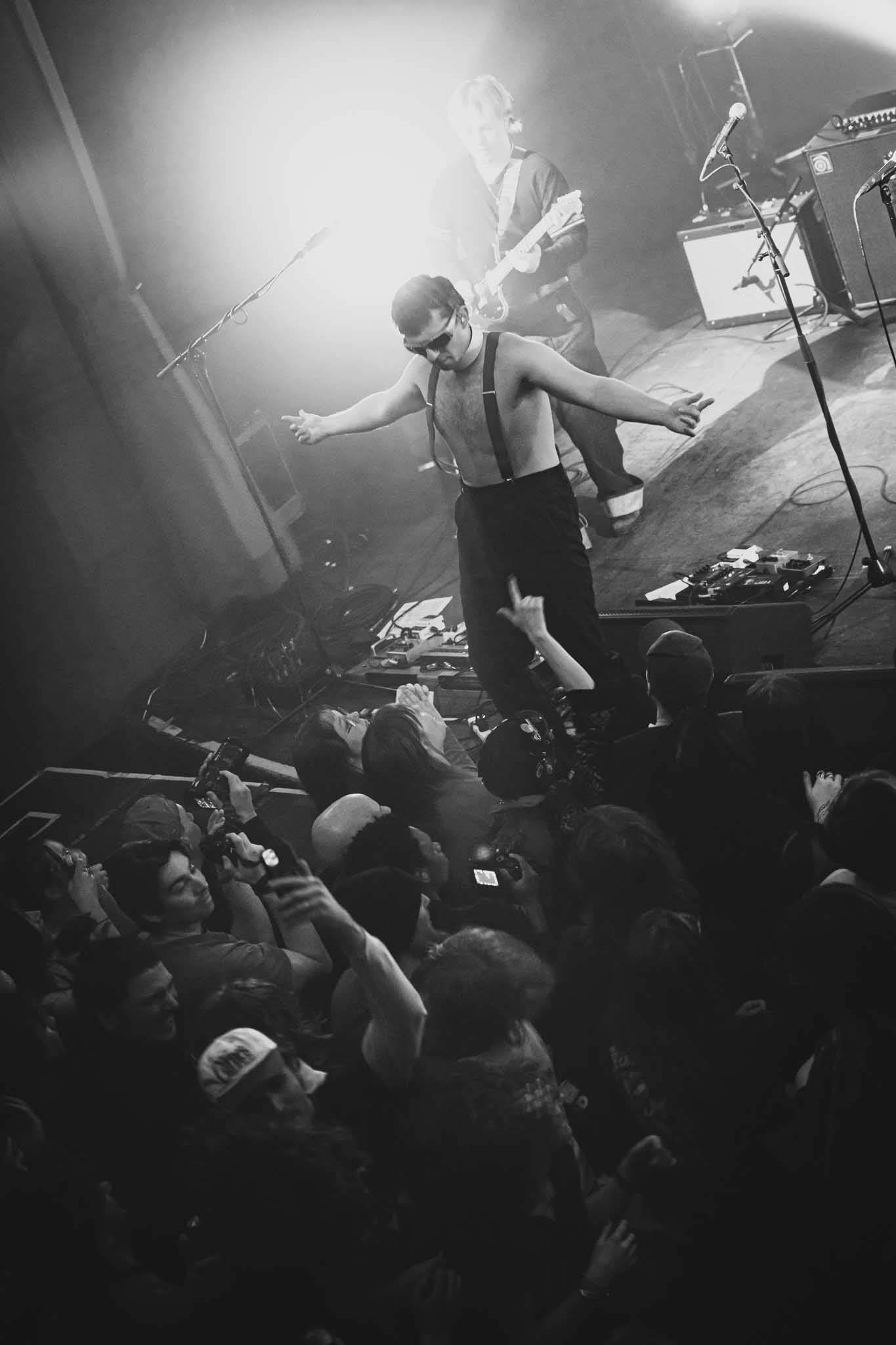 Shame est reconnu pour ses prestations dynamiques et leur prestation hier soir n’a pas fait mentir la rumeur. Le quintette anglais était en grande forme. C’est particulièrement vrai pour le chanteur Charlie Steen et le bassiste Josh Finerty qui en mènent large au centre de la scène. Dès Axis of Evil, qui a ouvert le concert, Steen invitait la foule à être partie intégrante du concert. Et elle l’a été! Body surfing, stage diving, flash de seins, mosh pit, tous les classiques du rock étaient au rendez-vous au Club Soda.