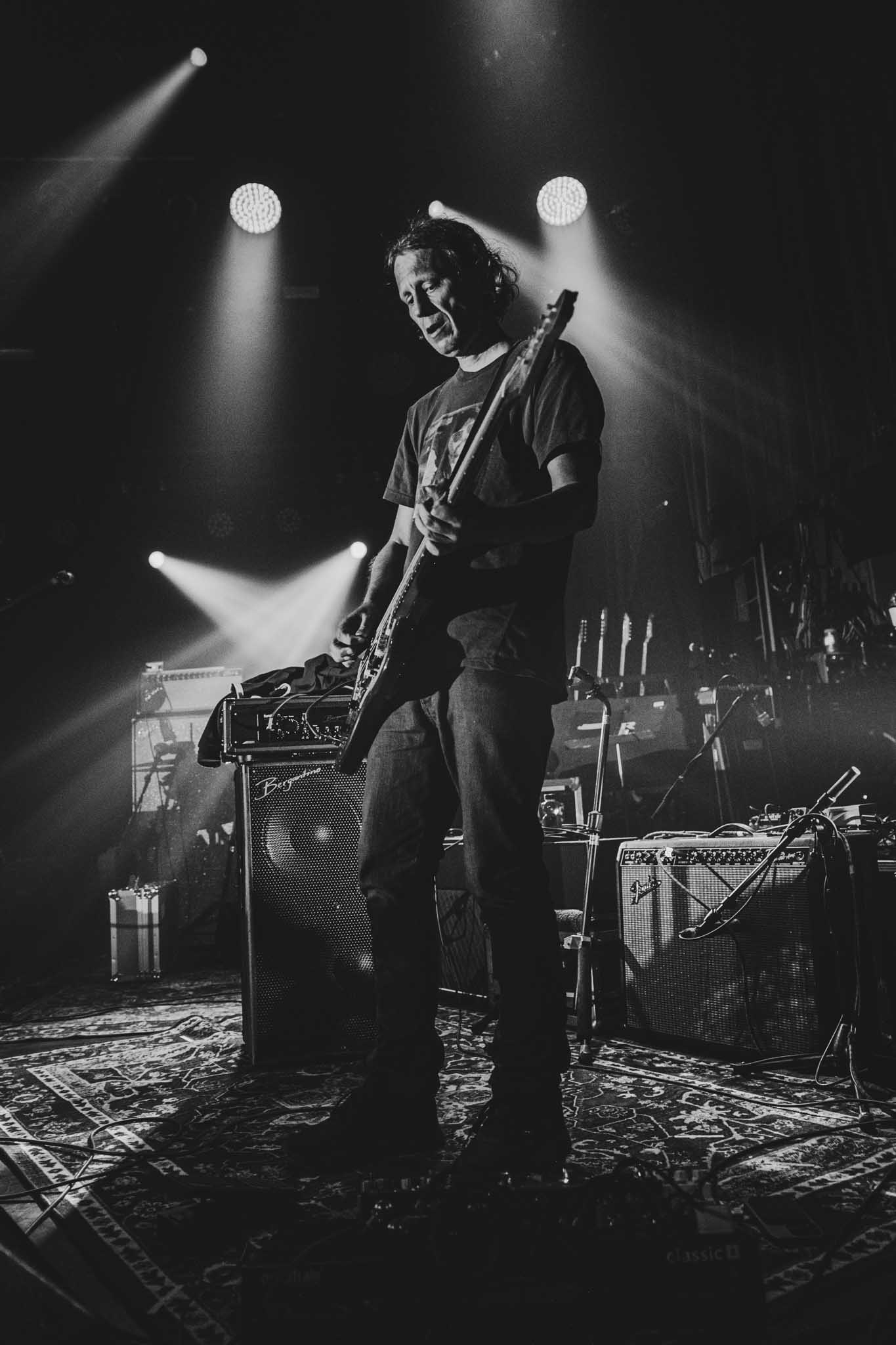 Flavor Crystals, un groupe de quatre musiciens, venu directement de Minneapolis, a ouvert le bal. Au menu, lumière froide, rythme lent, mais une ambiance sonore lourde. Sur scène, Josh Richardson à la guitare et à la voix, bouge avec son instrument ayant l’air de se révolter pendant que les autres membres sont cloués au sol, concentrés sur leurs pédales. Une ambiance qui rappelle celle du spectacle Ciel Noir, présenté par Blue Sky Turn Black, il y a quelques années. Quelque chose qui fait penser au krautrock et un son psychédélisme modéré, pas dans les aigus, mais dans les notes très graves. Pas trop loin de l’acte principal, mais agréable à l’écoute. Une sorte d’ambiance atmosphérique qui saisit sans exciter les gens pour autant. Aussi, le mix de la voix, était horrible.