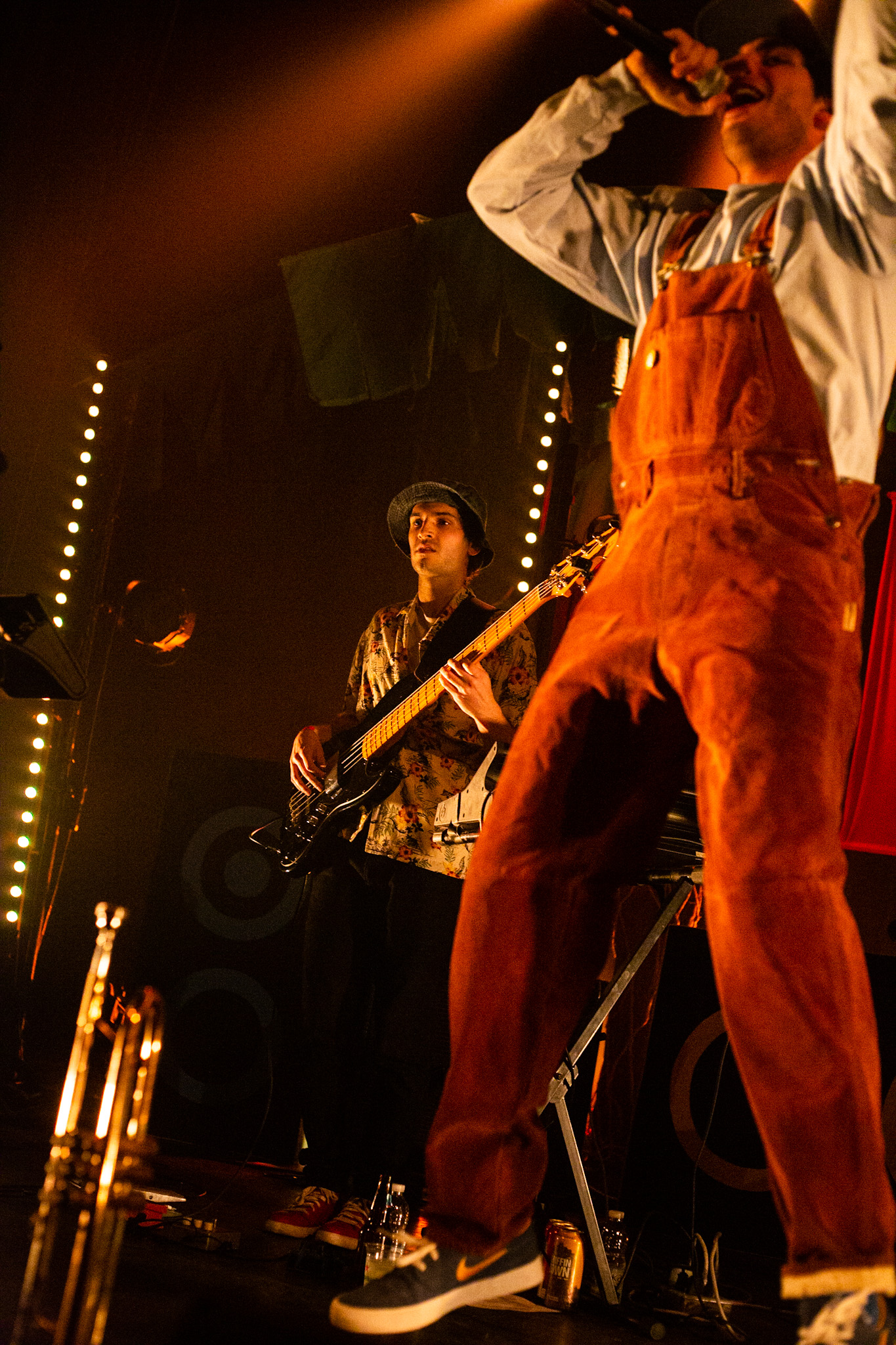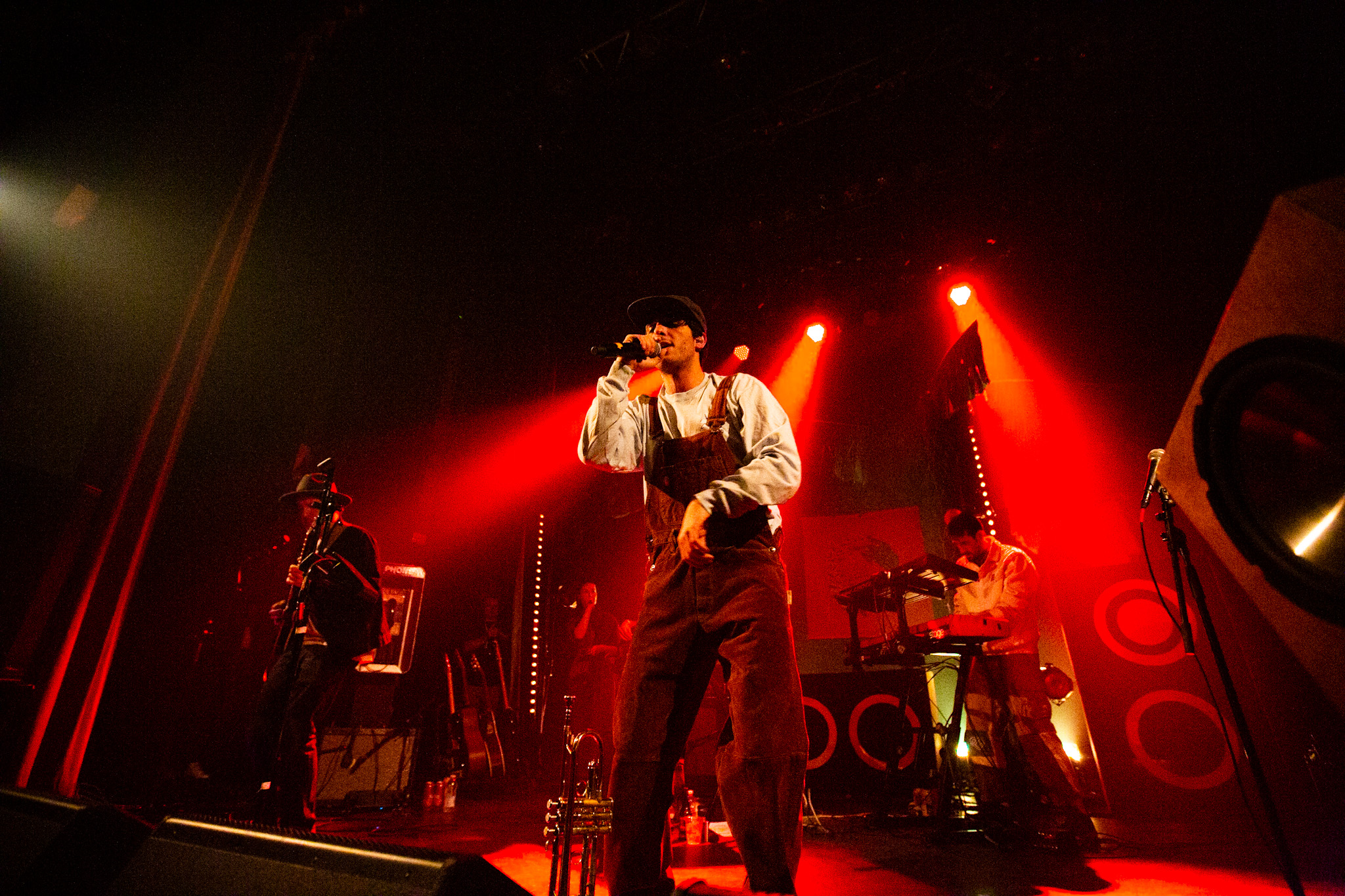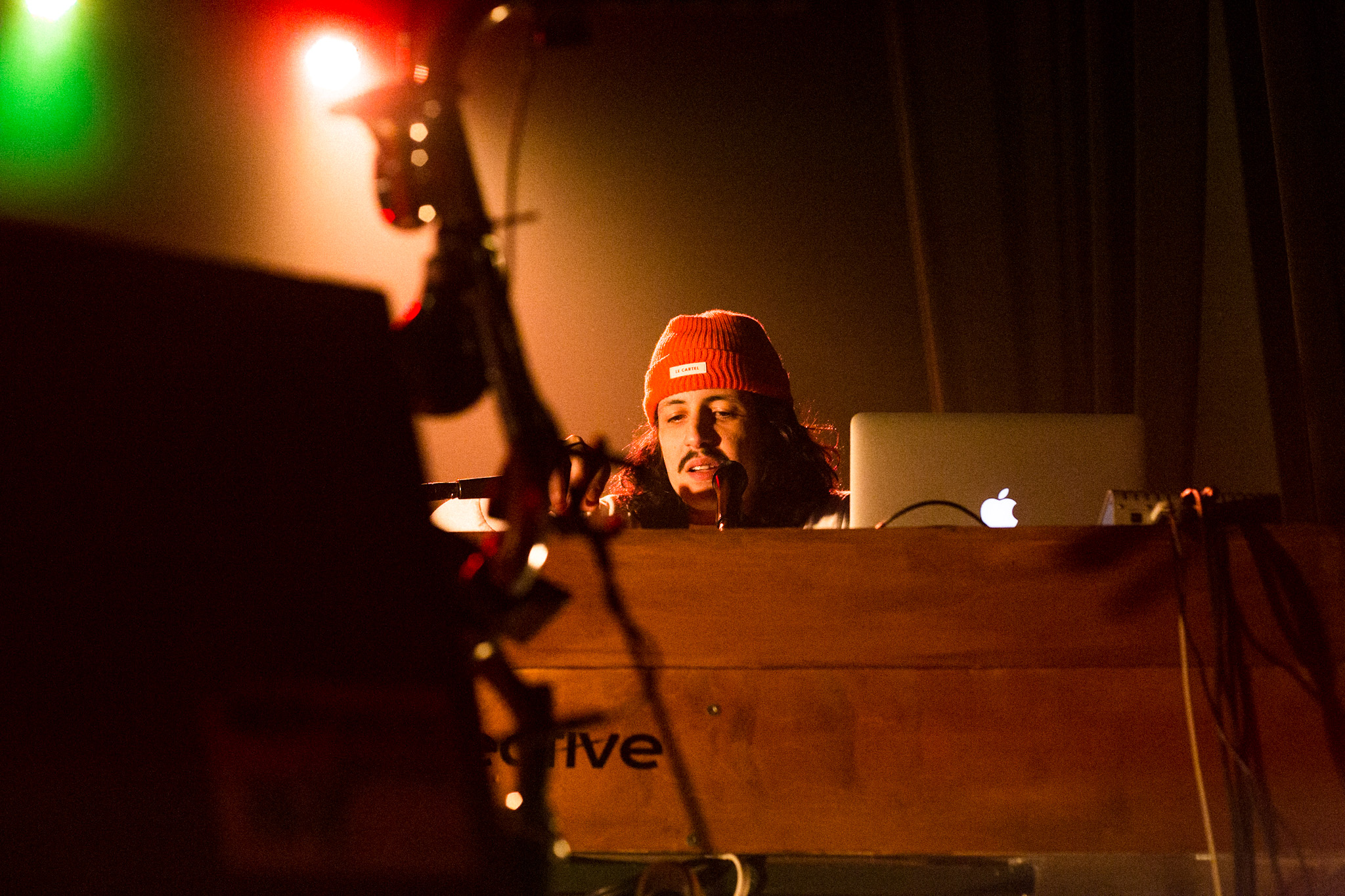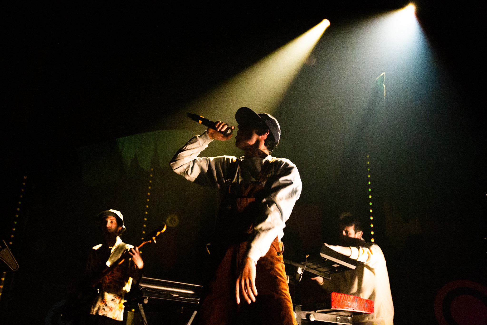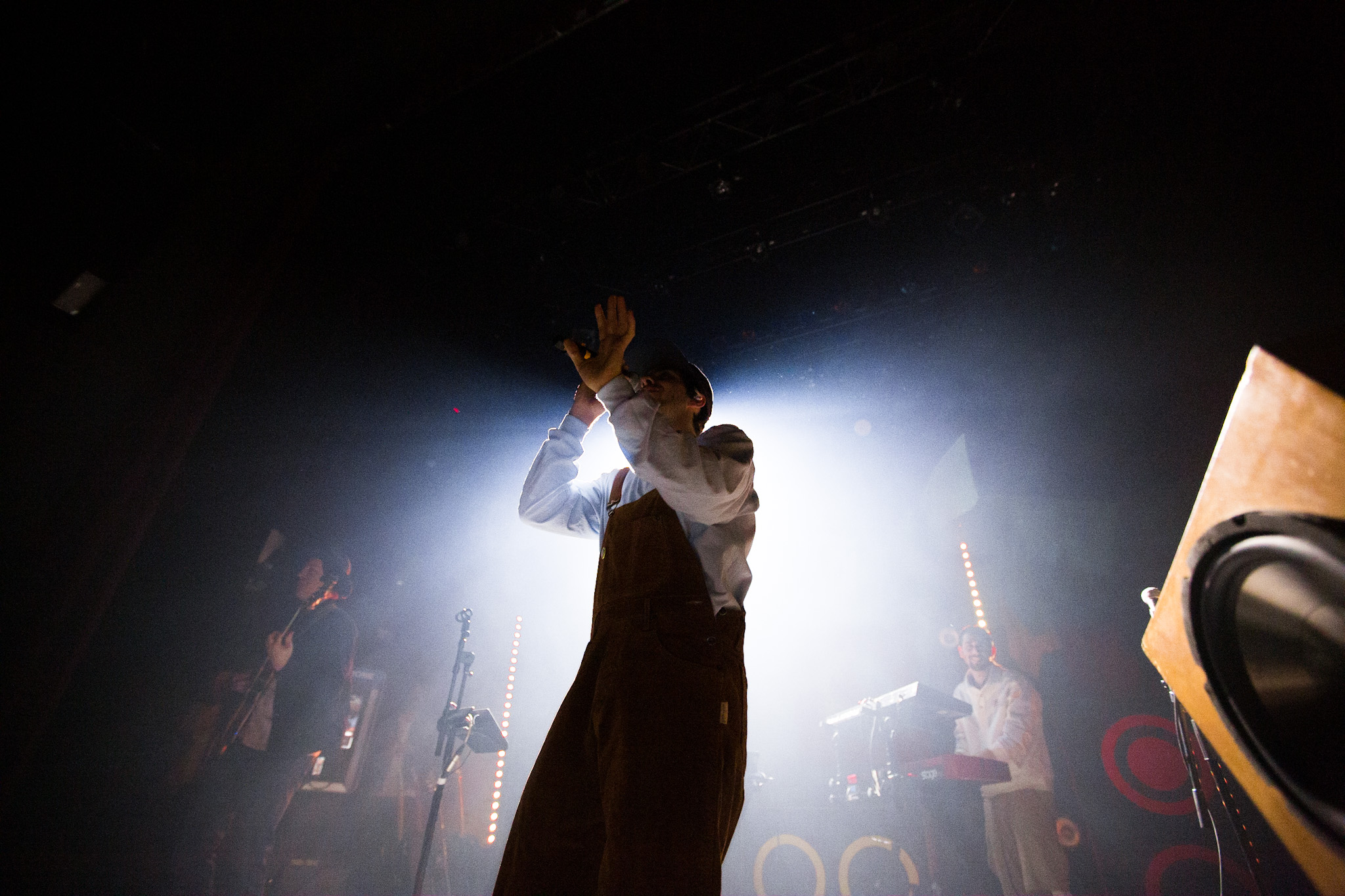 Sans se faire attendre, Clay & Friends a rapidement ouvert le spectacle en proposant un décor exotique aux couleurs de leur dernier EP : Grouillades. C’est dans une ambiance survoltée qu’il a débuté avec OMG, Gainsbourg, Name on It, OK, LEtTRe À SIMONE et Grouillades. Rien de mieux pour bien réchauffer la foule et pour la faire danser jusqu’à la fin du spectacle. Mike Clay a su, avec brio, animer un Club Soda (qui affichait complet) en racontant des blagues, en nous jasant en franglais et en se mettant torse nu sous sa salopette. On a eu droit à un coup de téléphone, parce qu’il y avait un téléphone public installé dans le décor, d’un certain Sam qui est par la suite venu lancer des popsicles dans la foule pour refroidir l’atmosphère brûlante de la salle.