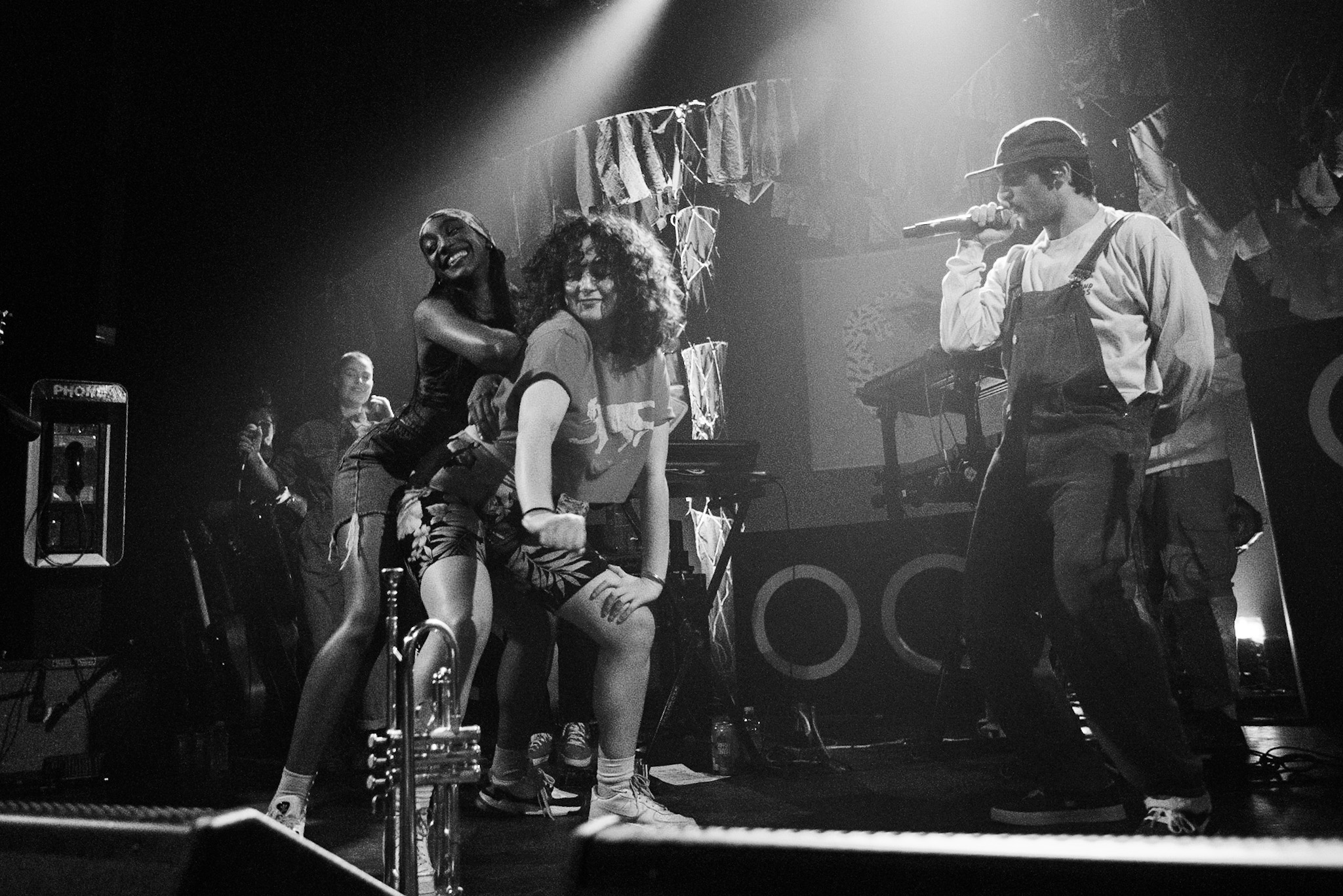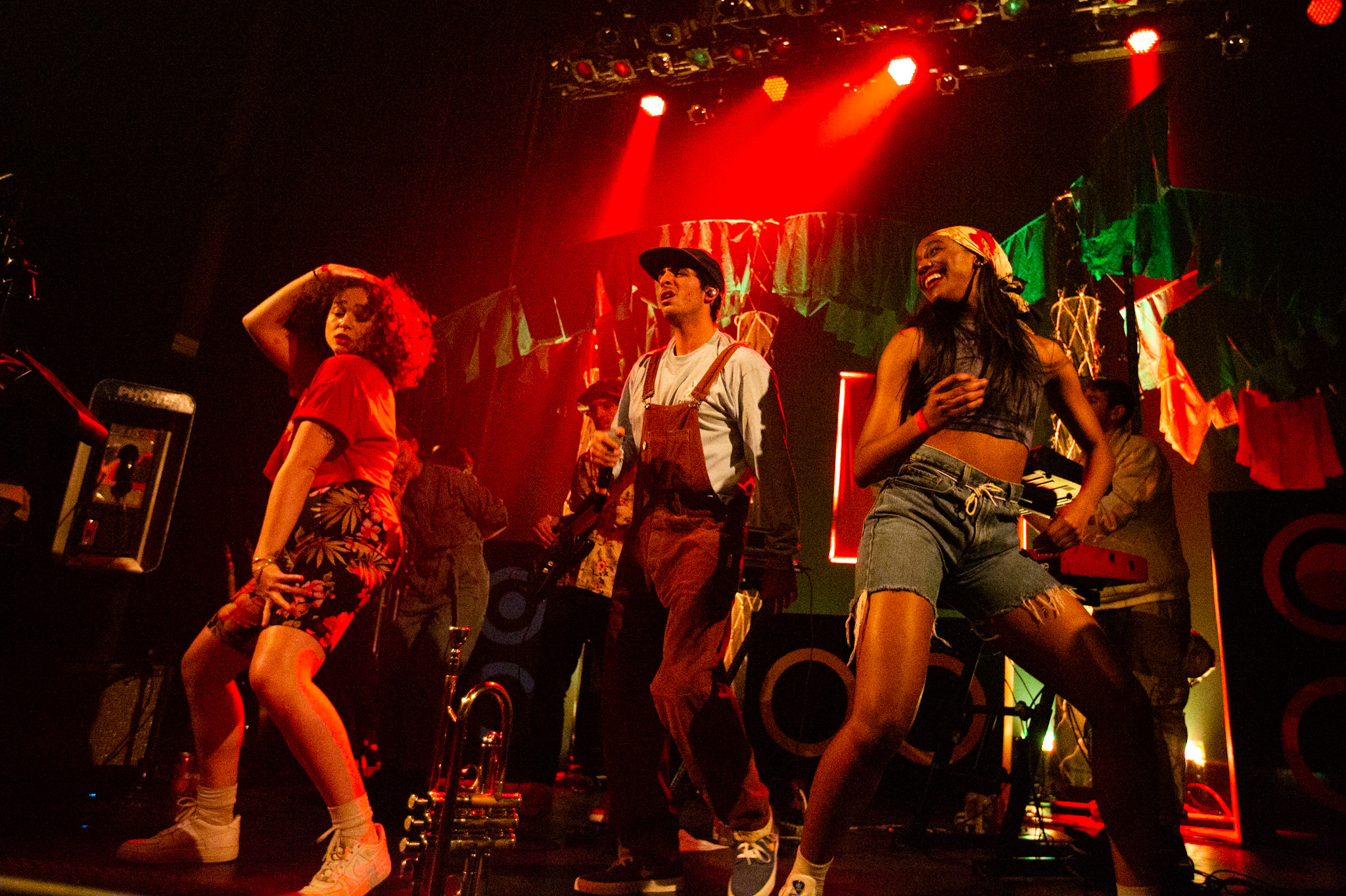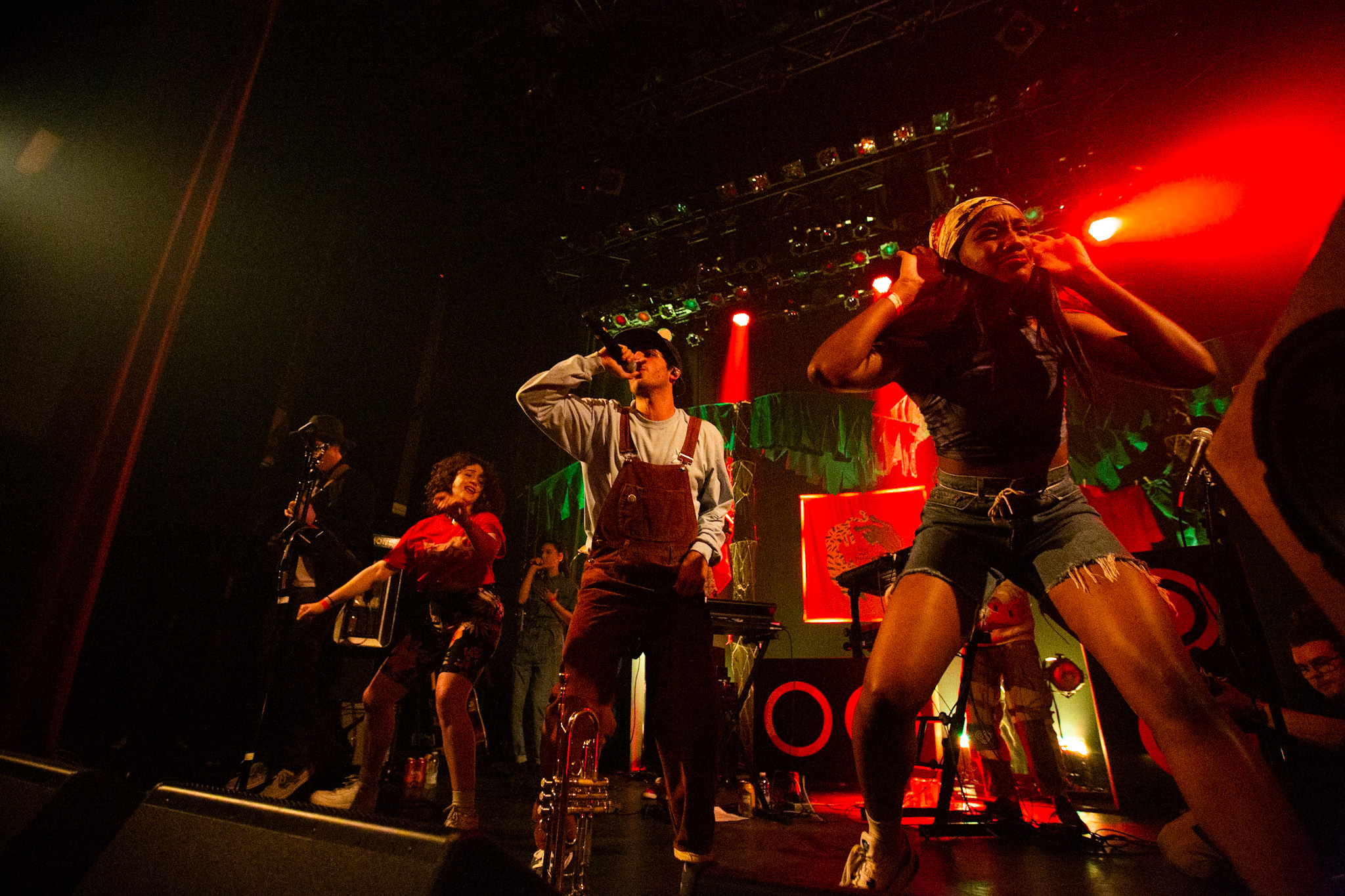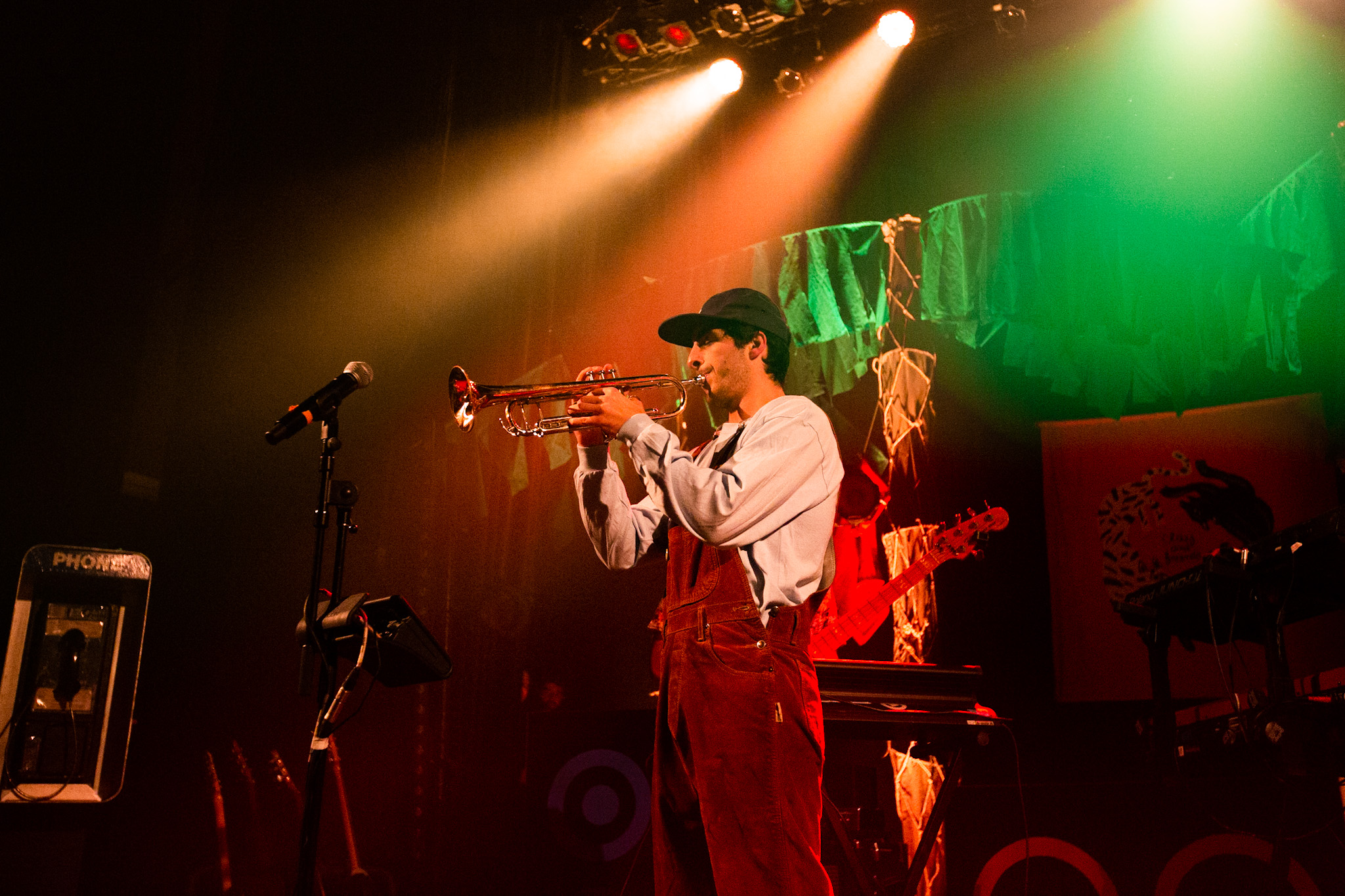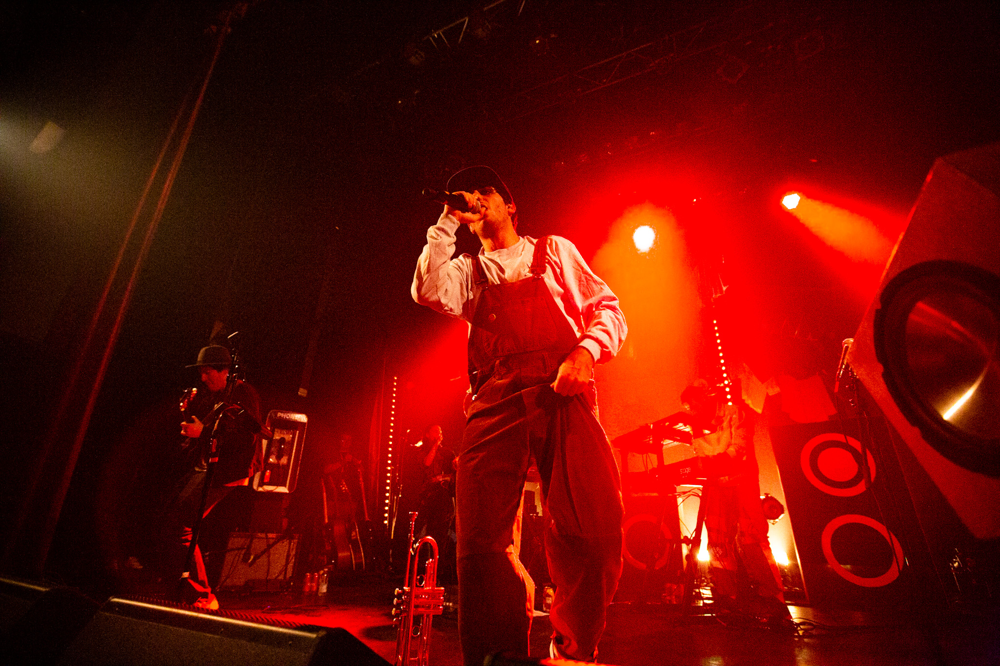 Sans se faire attendre, Clay & Friends a rapidement ouvert le spectacle en proposant un décor exotique aux couleurs de leur dernier EP : Grouillades. C’est dans une ambiance survoltée qu’il a débuté avec OMG, Gainsbourg, Name on It, OK, LEtTRe À SIMONE et Grouillades. Rien de mieux pour bien réchauffer la foule et pour la faire danser jusqu’à la fin du spectacle. Mike Clay a su, avec brio, animer un Club Soda (qui affichait complet) en racontant des blagues, en nous jasant en franglais et en se mettant torse nu sous sa salopette. On a eu droit à un coup de téléphone, parce qu’il y avait un téléphone public installé dans le décor, d’un certain Sam qui est par la suite venu lancer des popsicles dans la foule pour refroidir l’atmosphère brûlante de la salle.