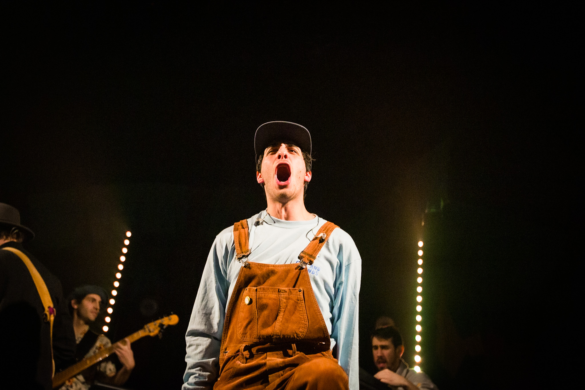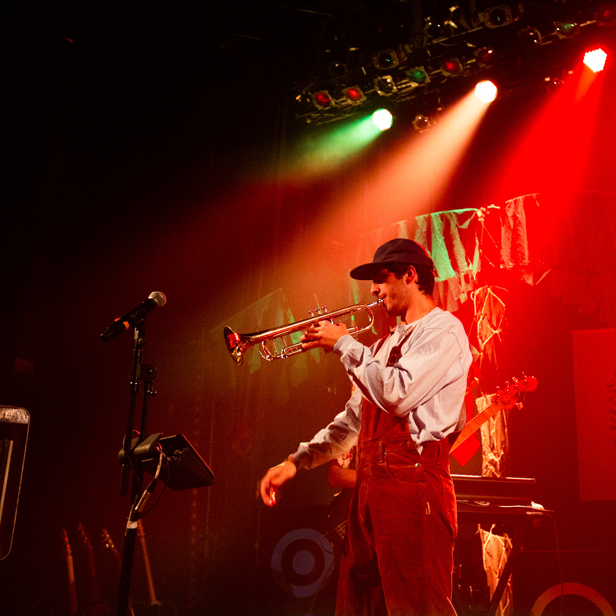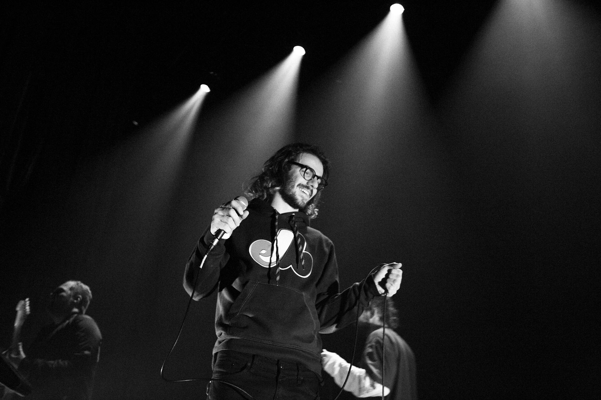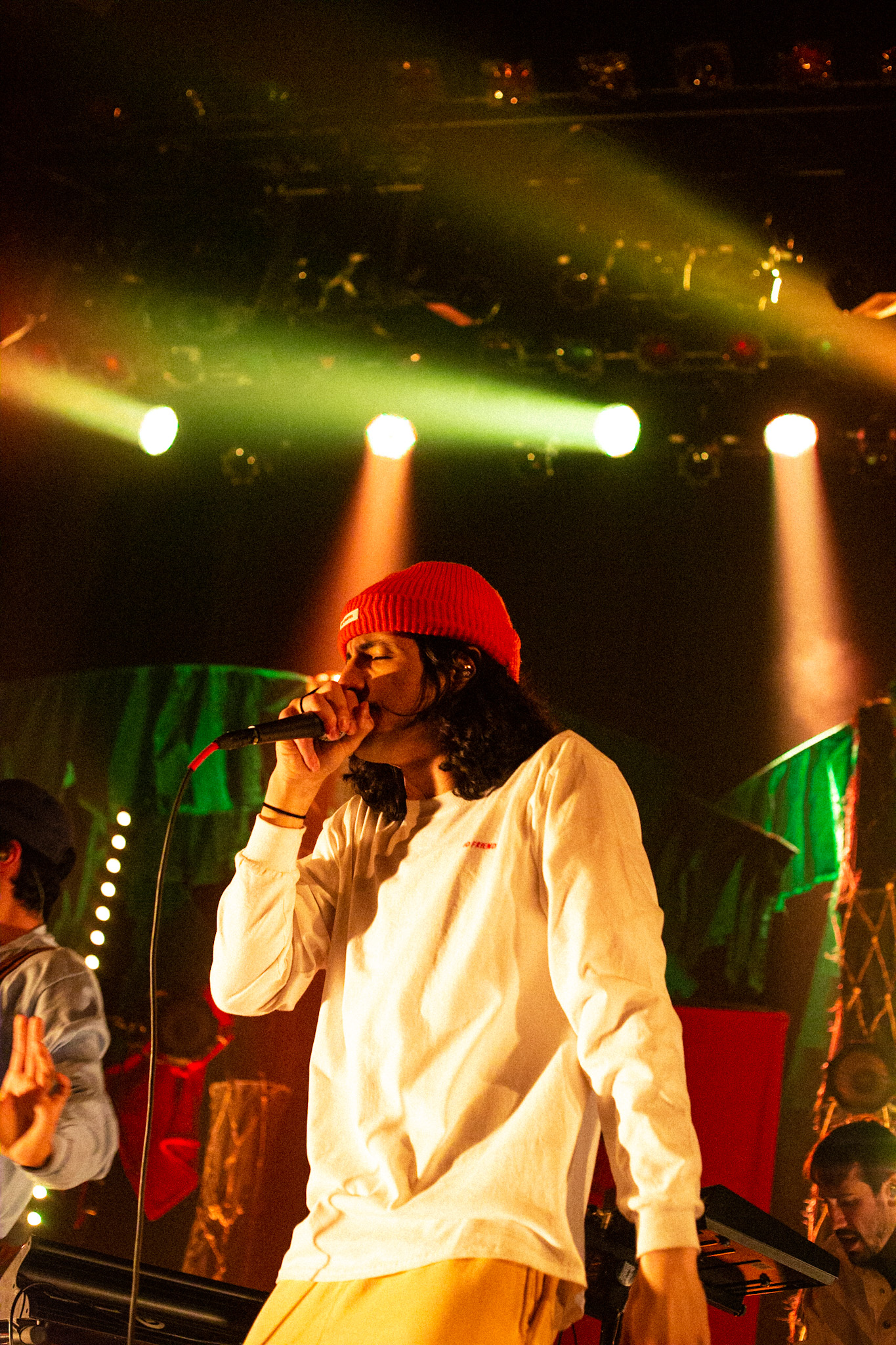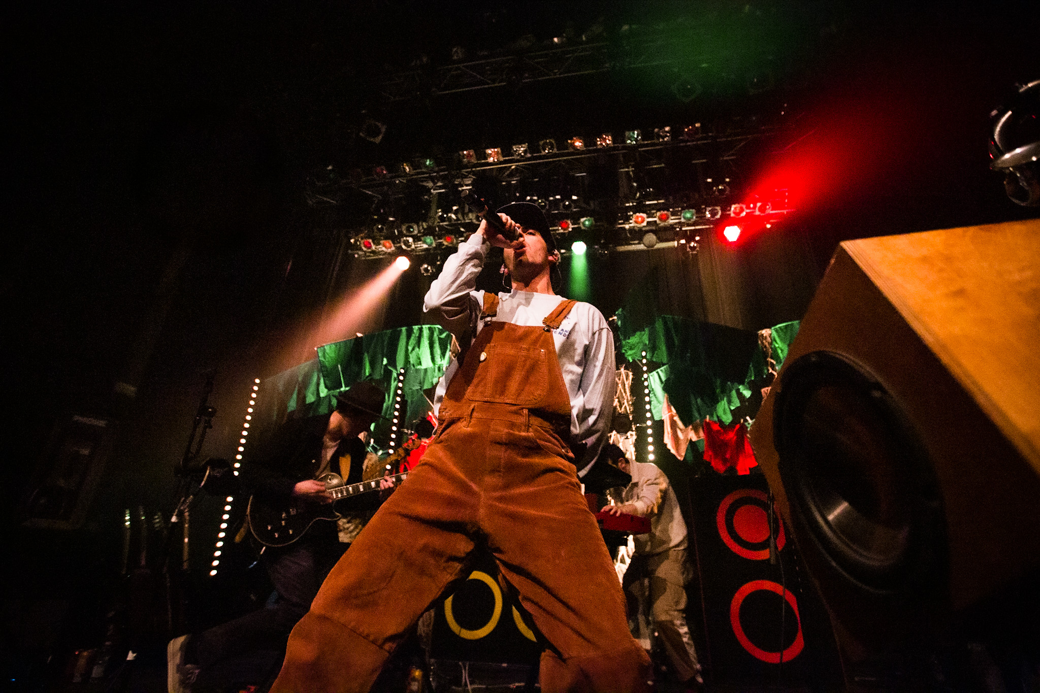 Sans se faire attendre, Clay & Friends a rapidement ouvert le spectacle en proposant un décor exotique aux couleurs de leur dernier EP : Grouillades. C’est dans une ambiance survoltée qu’il a débuté avec OMG, Gainsbourg, Name on It, OK, LEtTRe À SIMONE et Grouillades. Rien de mieux pour bien réchauffer la foule et pour la faire danser jusqu’à la fin du spectacle. Mike Clay a su, avec brio, animer un Club Soda (qui affichait complet) en racontant des blagues, en nous jasant en franglais et en se mettant torse nu sous sa salopette. On a eu droit à un coup de téléphone, parce qu’il y avait un téléphone public installé dans le décor, d’un certain Sam qui est par la suite venu lancer des popsicles dans la foule pour refroidir l’atmosphère brûlante de la salle.