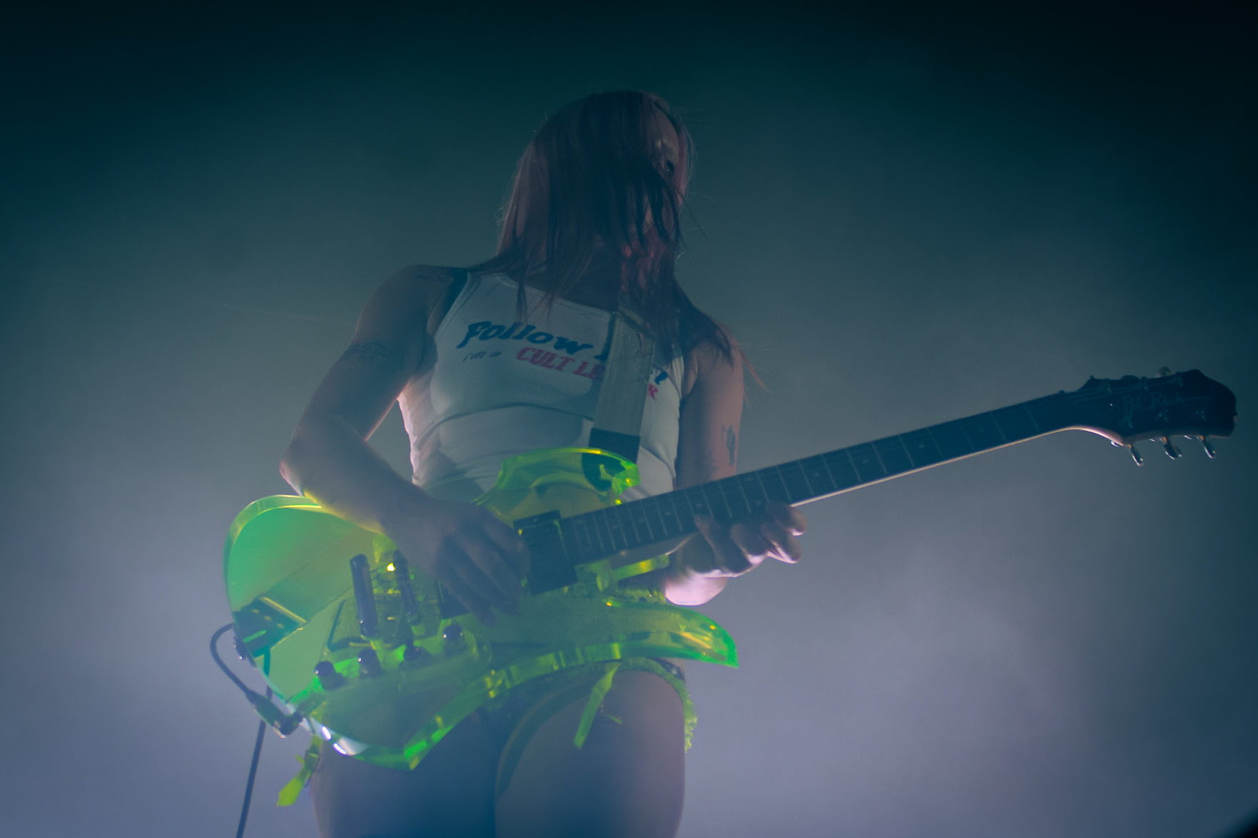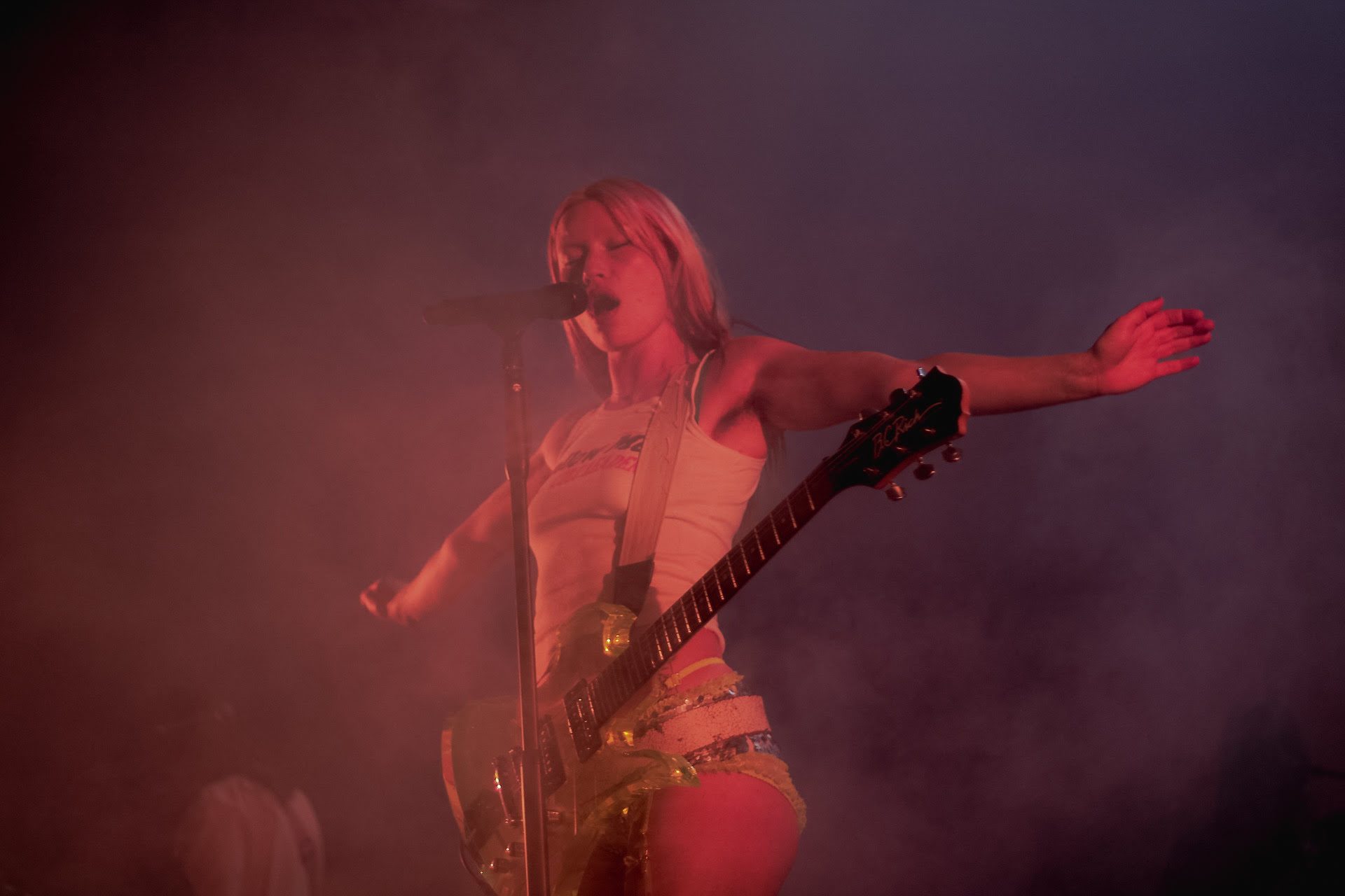 J’aurais pris aussi plus d’Hester Chambers qui est à l’arrière du groupe, dans un habit noir qui jure avec le reste du groupe en blanc. Un peu comme si c’était le vilain petit canard. Alors que Rhian Teasdale assume de plus en plus le rôle de la « front woman » du groupe (et elle le fait très bien), Chambers semble se retirer de plus en plus de l’œil du public. C’est dommage parce que les guitares de Chambers sont si intéressantes. J’aurais pris un peu plus de folie, un peu plus de traits de crayons qui dépassent des marges.