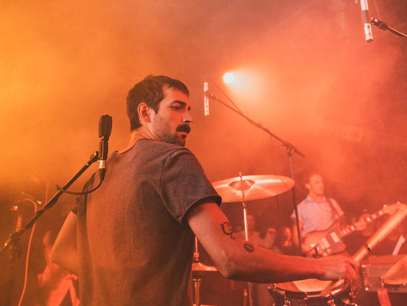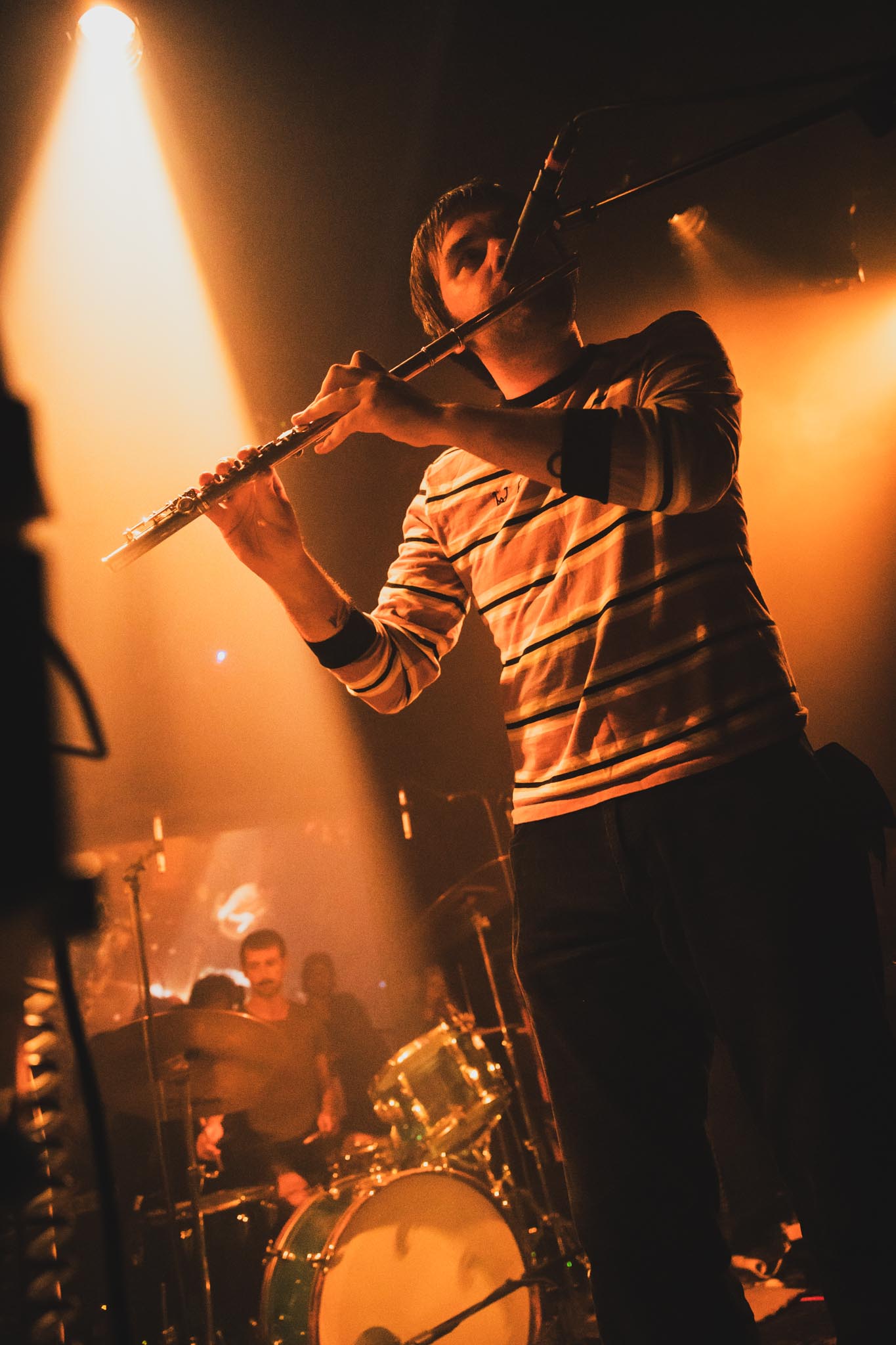 Comme pour le concert M pour Mothland (présenté pendant MARATHON de M pour Montréal), la scène est au parterre et sur la vraie scène de la Sala, une projection est diffusée d’une vue du spectacle filmé en plongée. Au total, six musiciens sont sur scène et entre la batterie, la basse, les claviers et le saxophone, certains échangent leur instrument le temps d’une chanson.